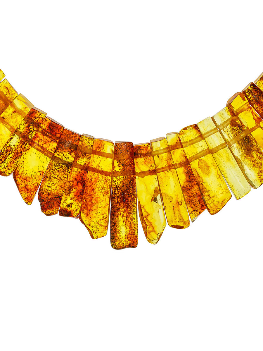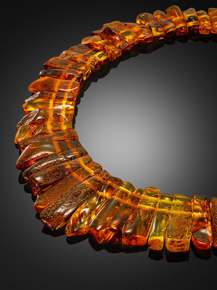 Натуральный балтийский янтарь обладает множеством полезных качеств — издавна известны его лечебные свойства (подробнее о лечебных свойствах янтаря), а также способность положительно воздействовать на эмоциональное состояние и настроение человека. Роскошное колье из нашей коллекции «Помпеи» в полной мере соответствует всем ожиданиям, которые можно предъявить изделию из натурального балтийского янтаря. Крупные пластинки из текстурного янтаря природной формы подверглись минимальной обработке, благодаря чему они не только сохранили все свои полезные свойства, но и эффектный вид. Такое колье отлично впишется не только в этнические или кантри образы, но и подойдёт к вечернему платью с открытыми плечами. _x000D_