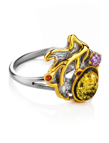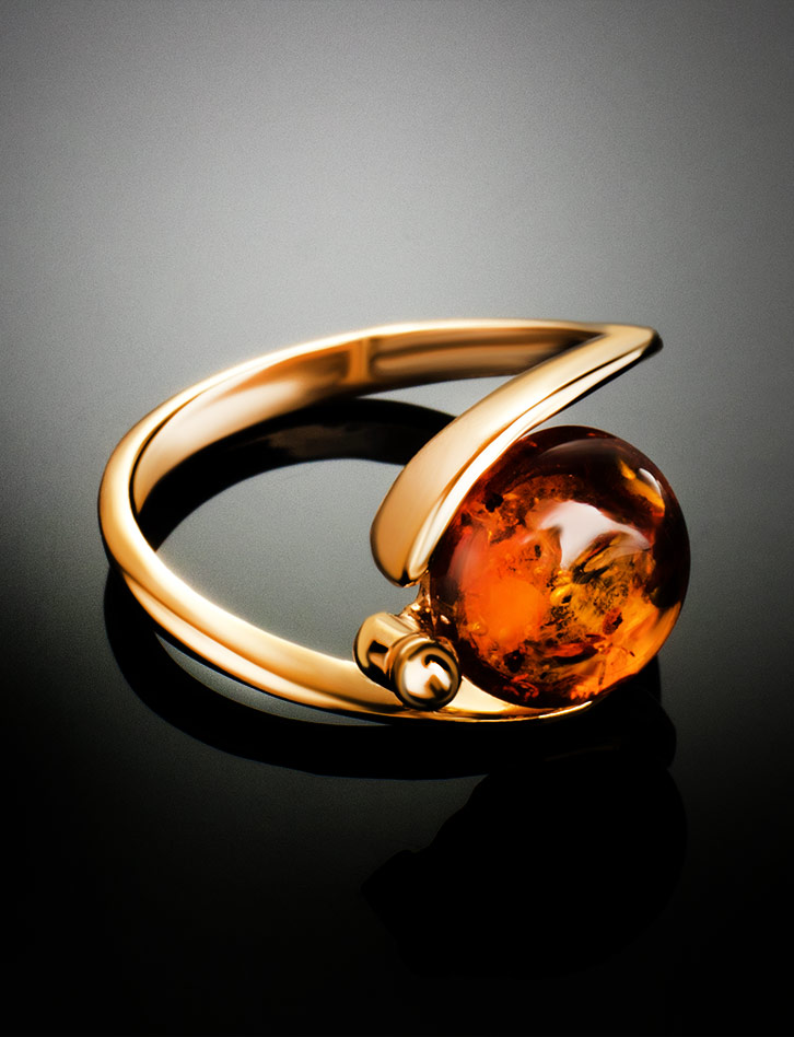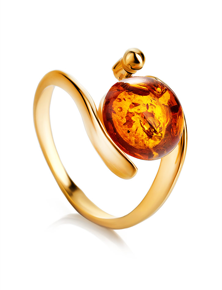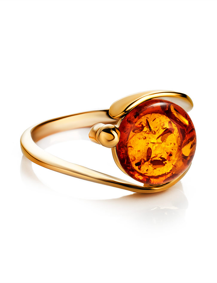 Красивое позолоченное кольцо с натуральным коньячным янтарём «Сфера»
