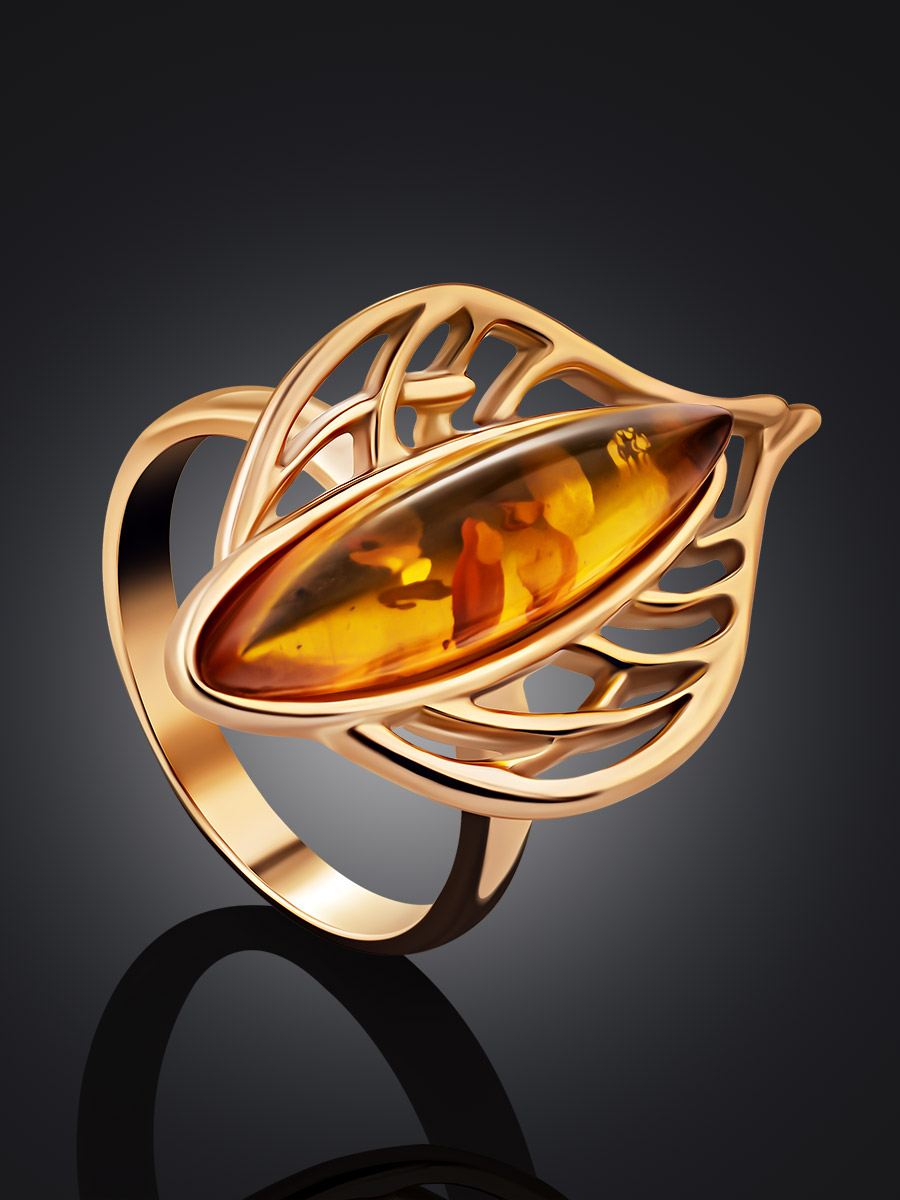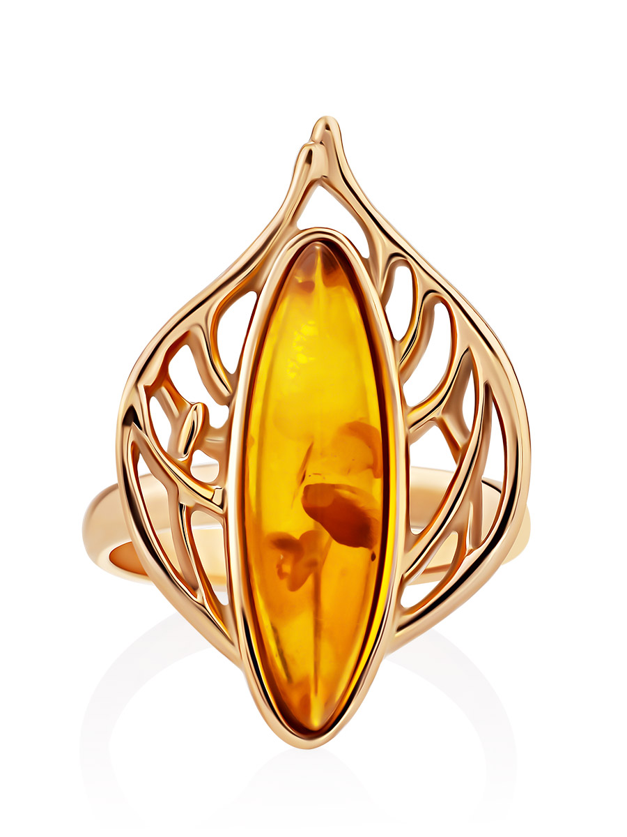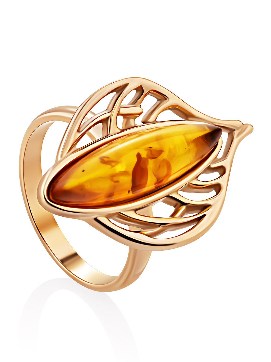 Красивое позолоченное кольцо с натуральным золотистым янтарём «Листочек»