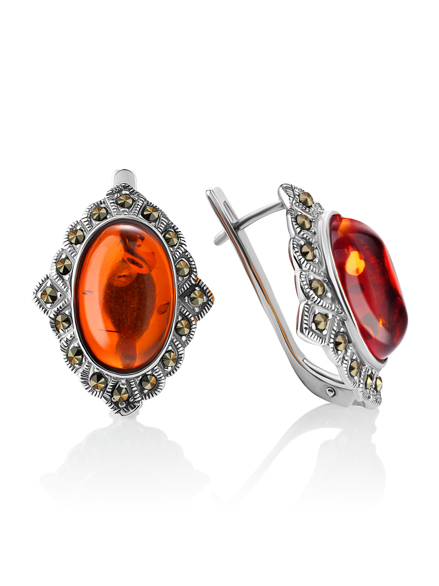 Красивые крупные серьги с янтарём и марказитами «Эйфория»