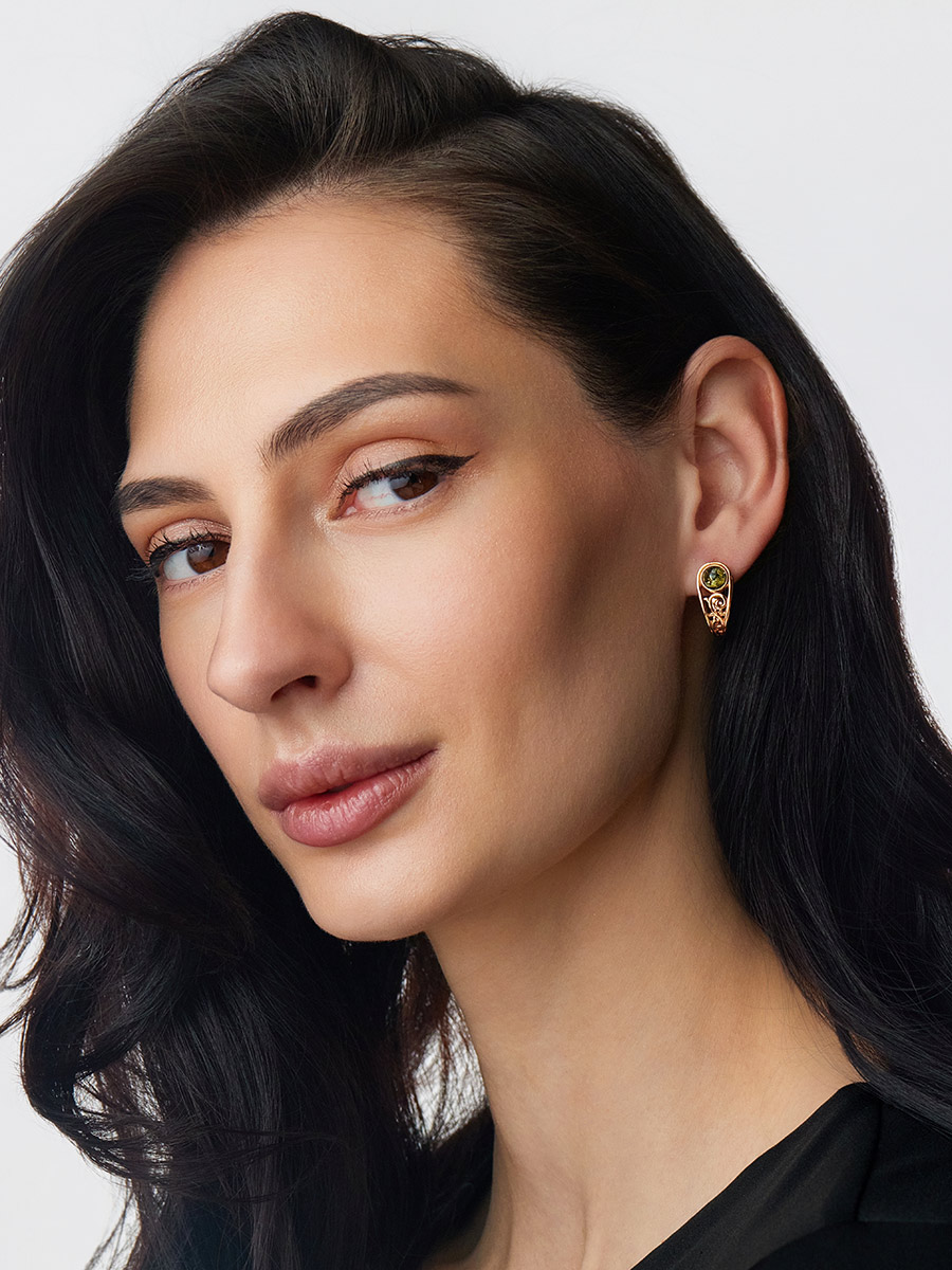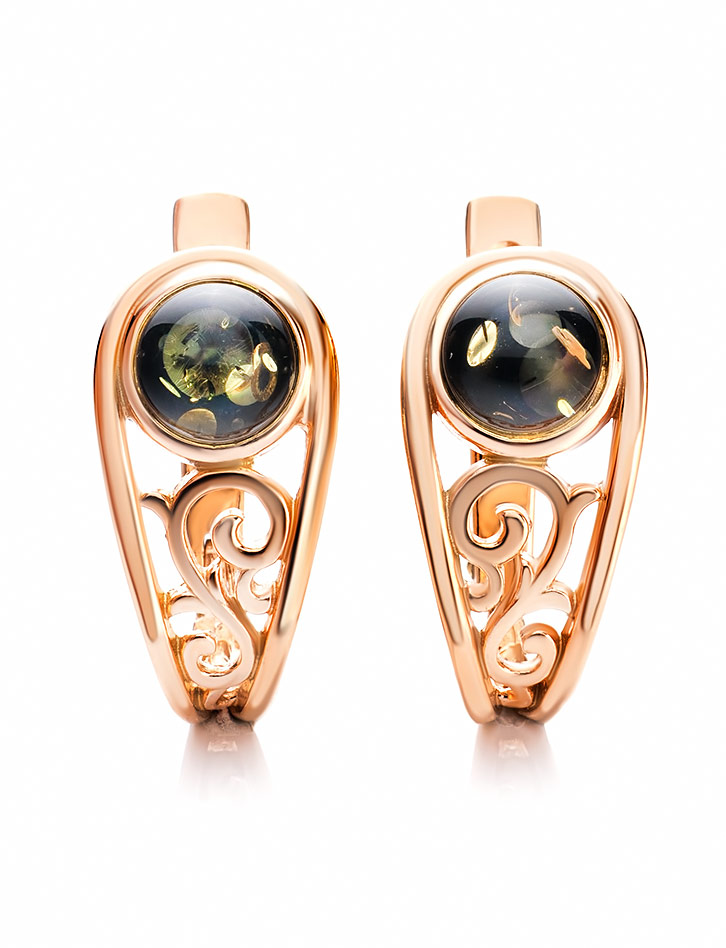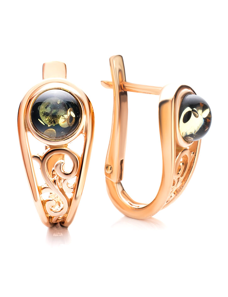 Красивые позолоченные серьги с зелёным янтарём «Шахерезада»