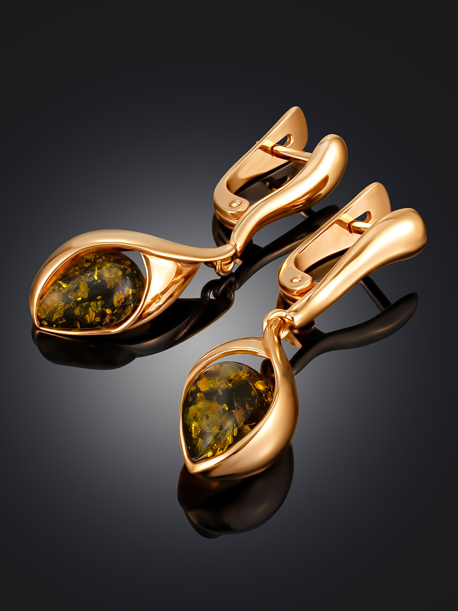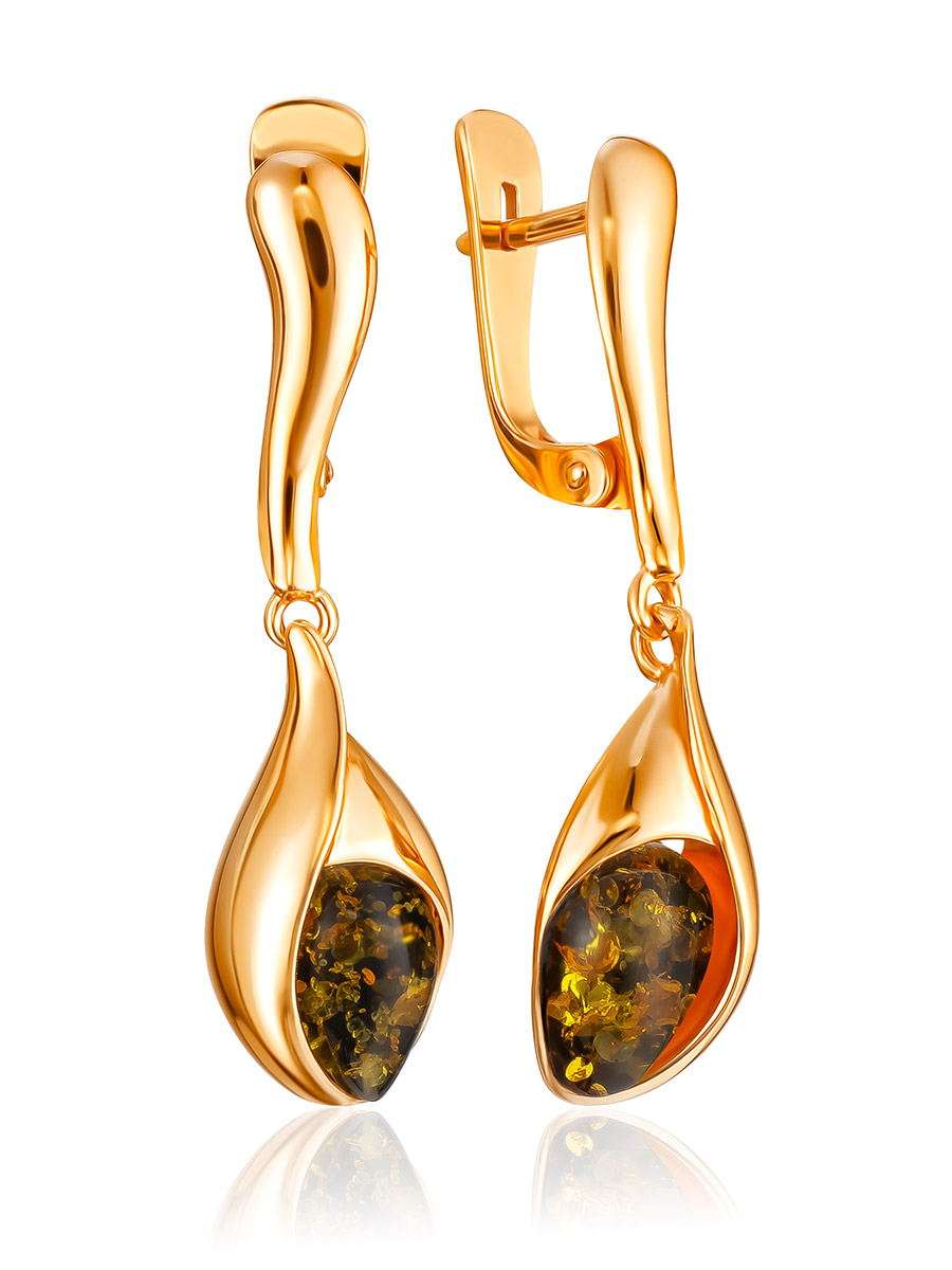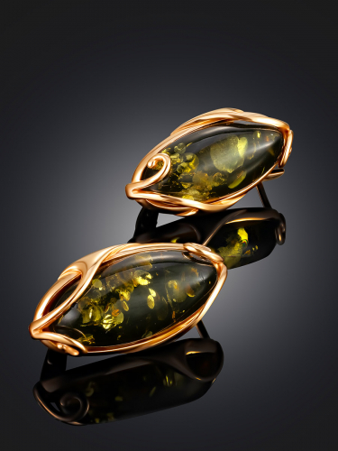 Красивые позолоченные серьги, украшенные янтарём зелёного цвета «Пион»