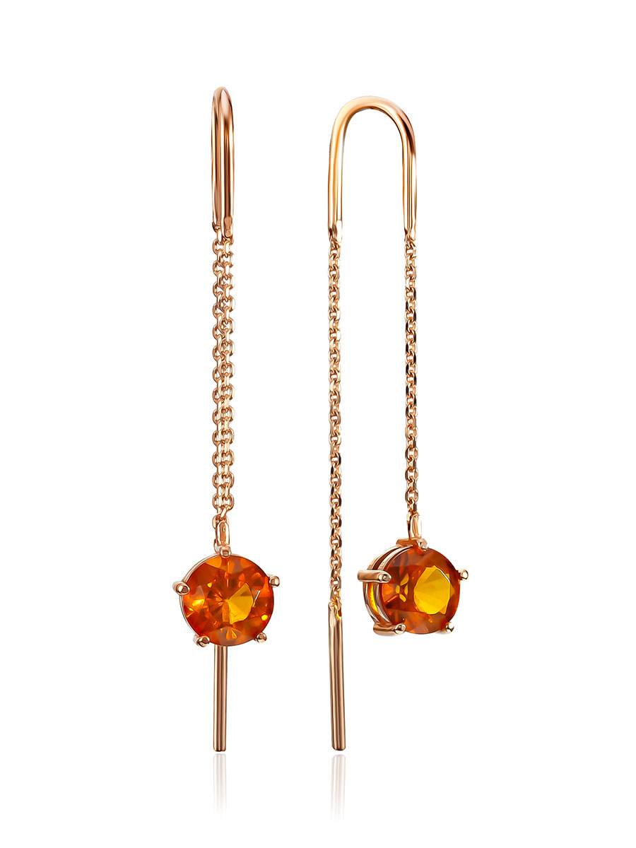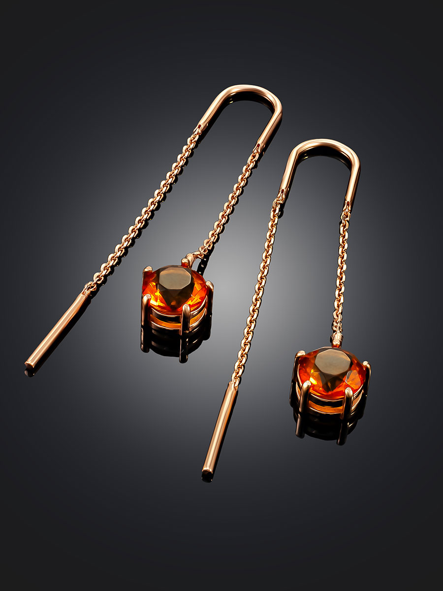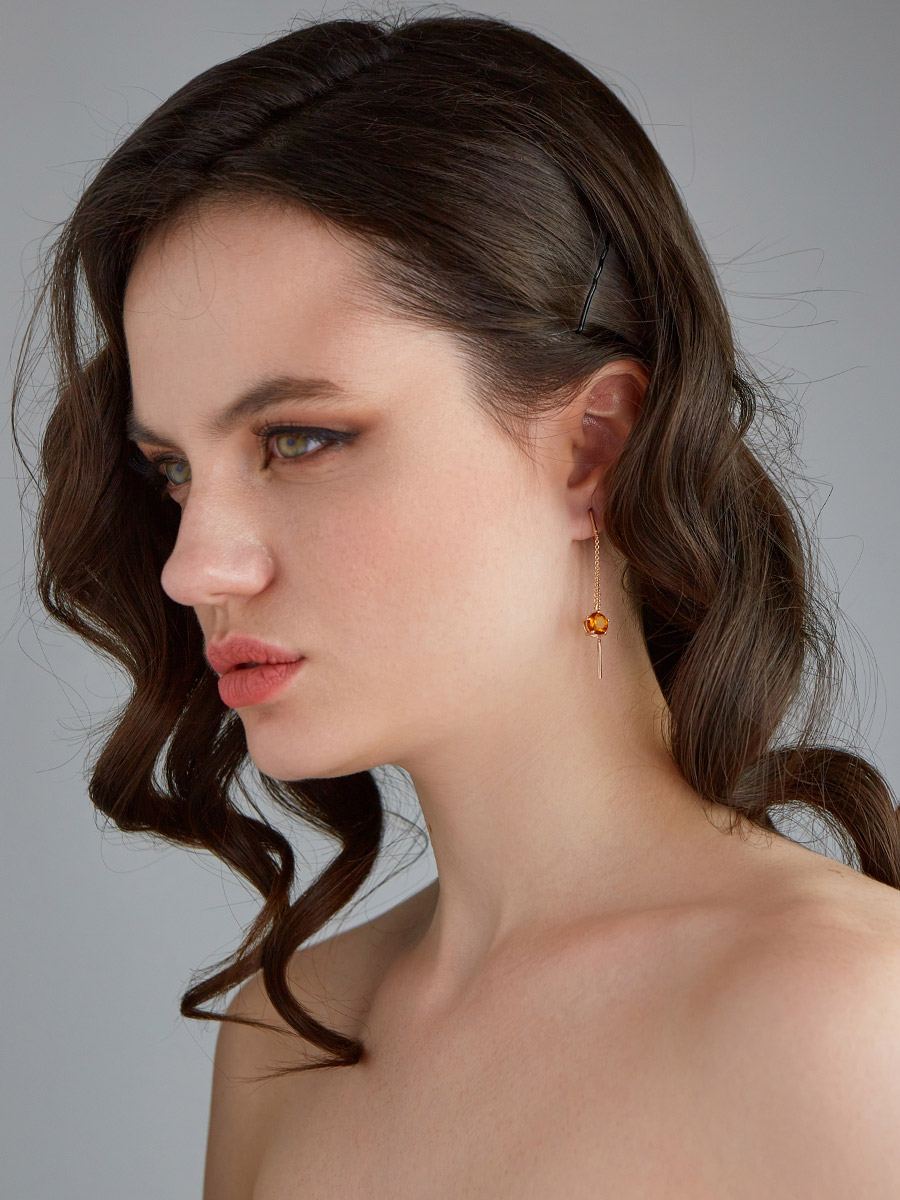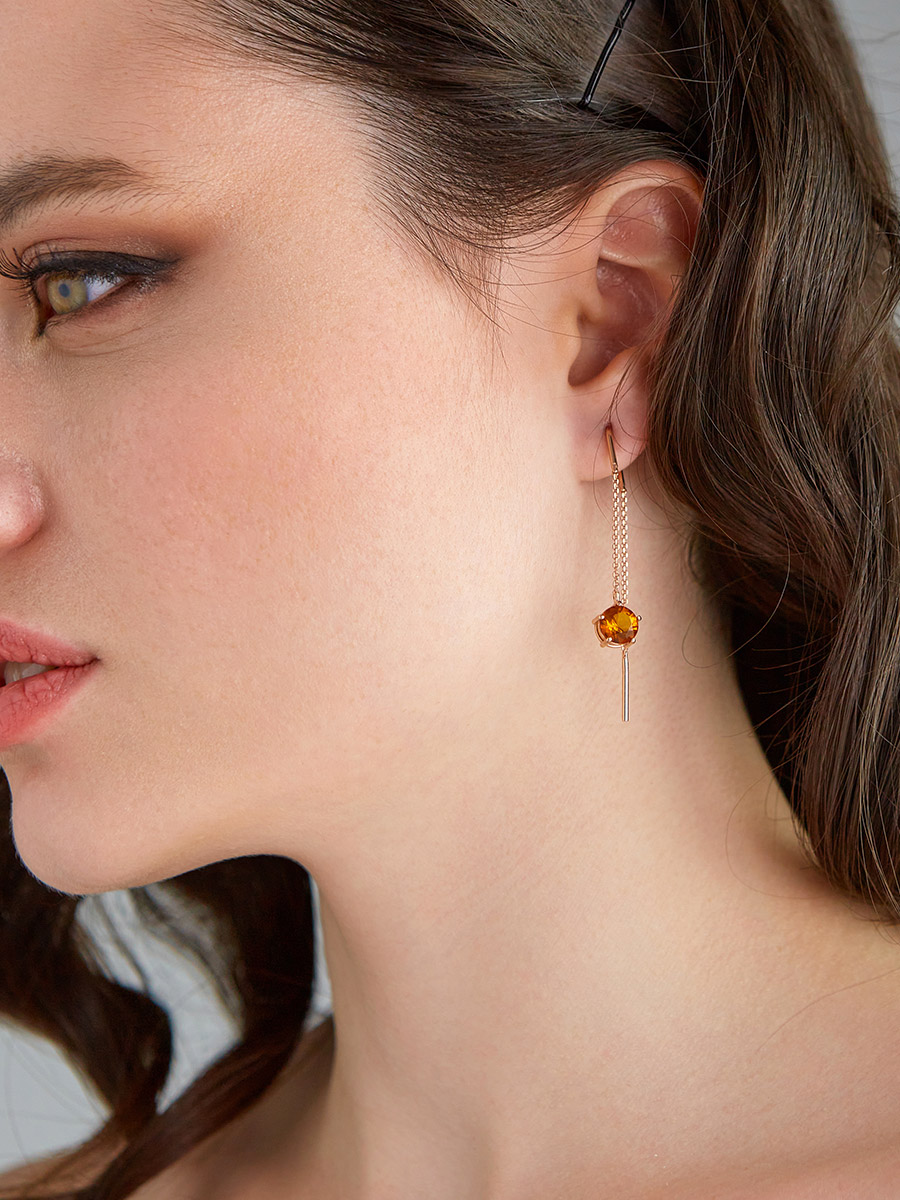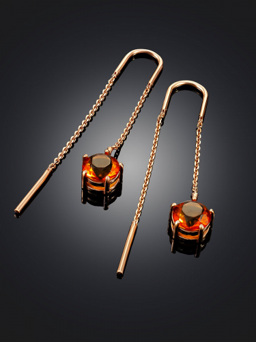 Красивые продевные серьги «Баккара» с гранёным коньячным янтарём
