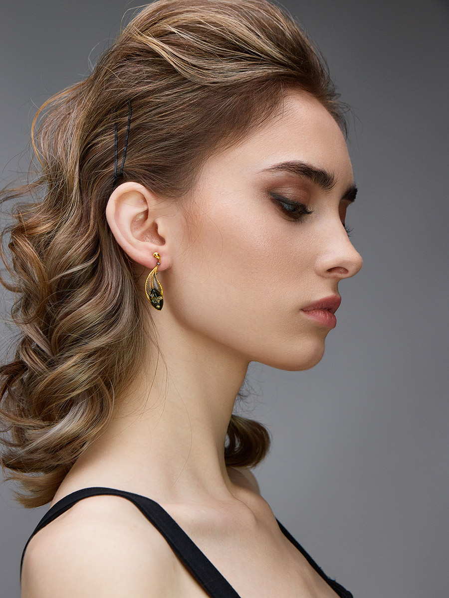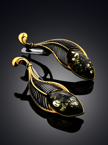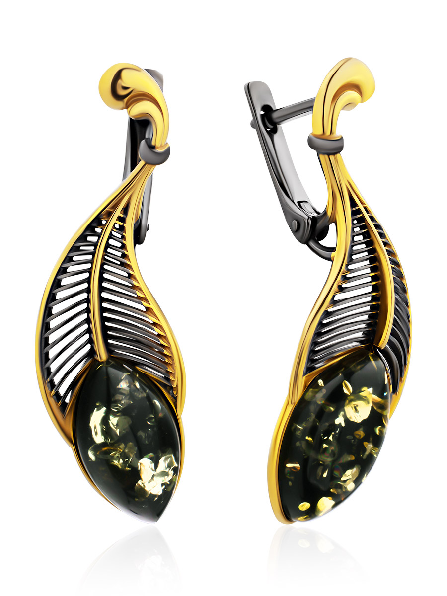 Красивые серьги с чернением и золочением, украшенные зелёным янтарём «Пёрышко»
