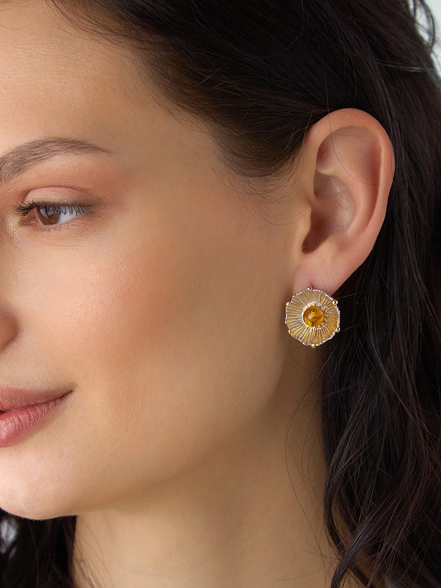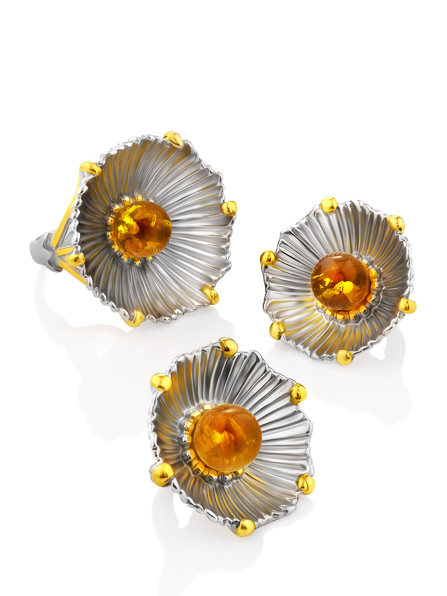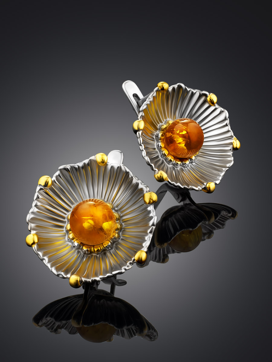 Красивые серьги с позолотой, украшенные натуральным янтарём «Флокс»
