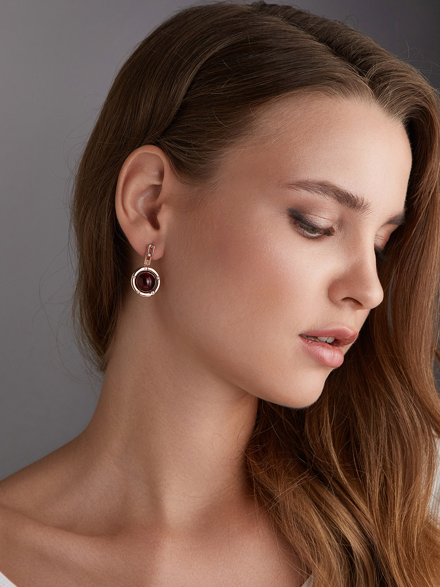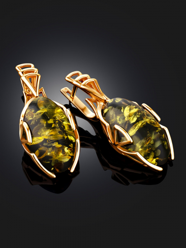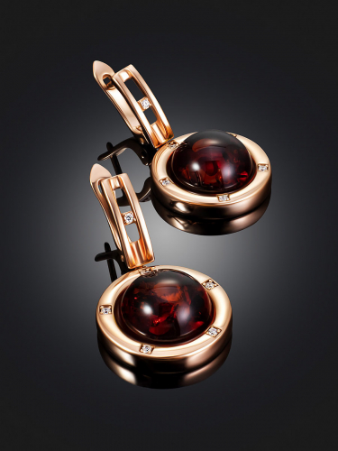 Красивые серьги с тёмно-коньячным янтарём и фианитами «Ампир»