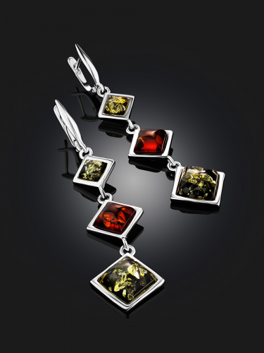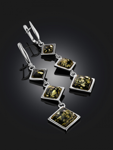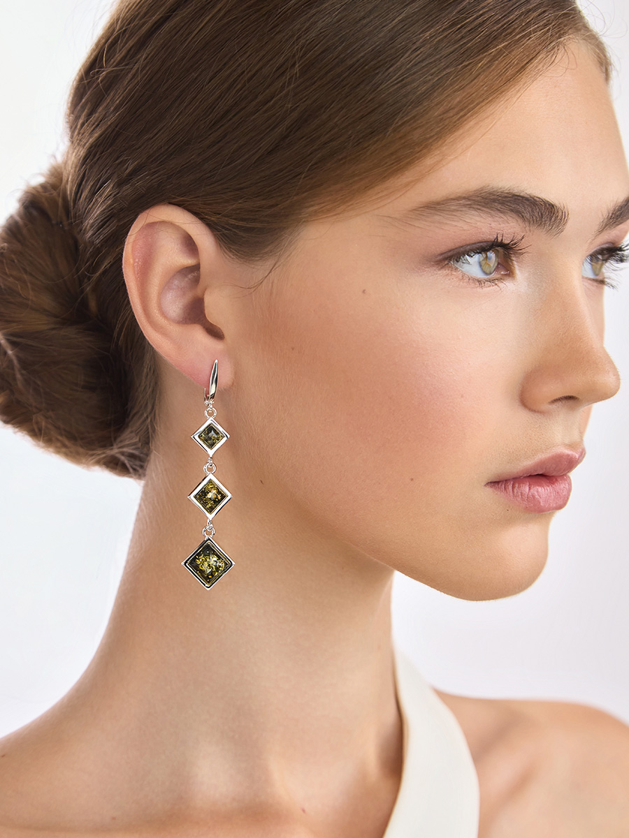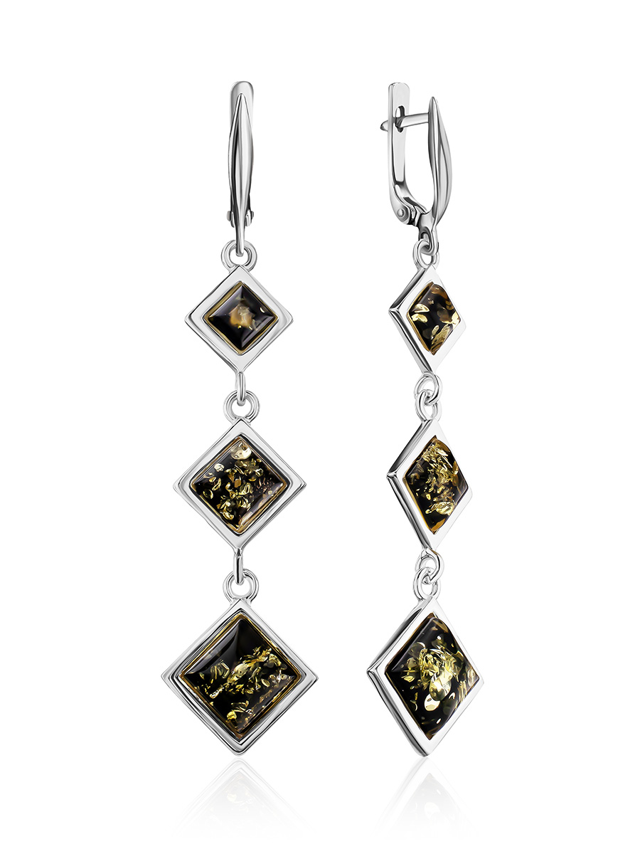 Красивые удлинённые серьги с янтарём зелёного цвета «Каледония»