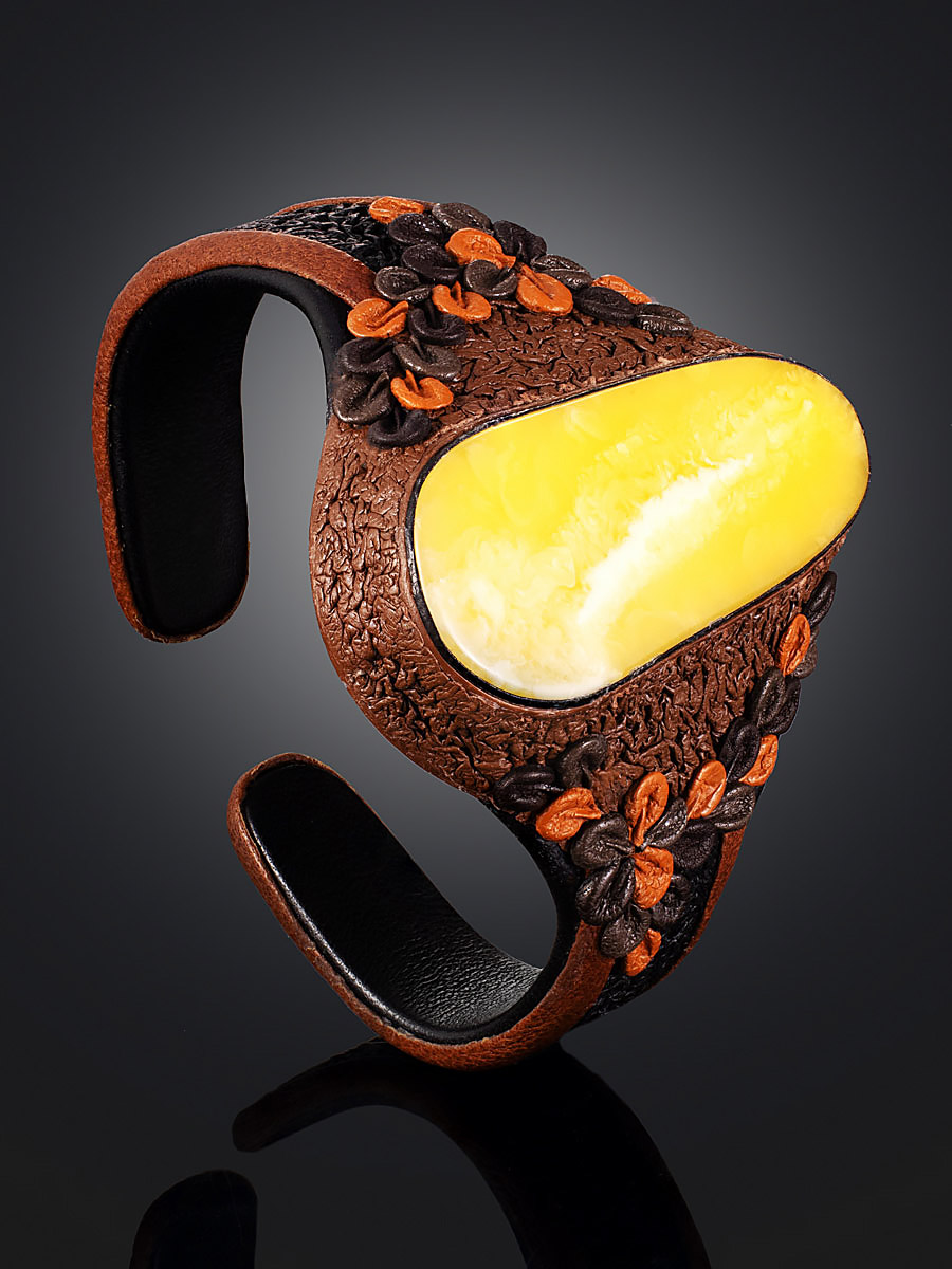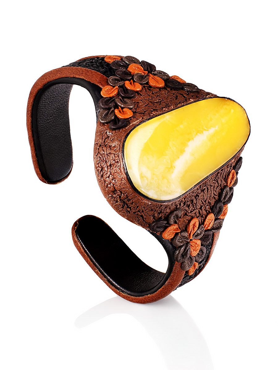 Красивый браслет из натуральной кожи и цельного янтаря «Нефертити»