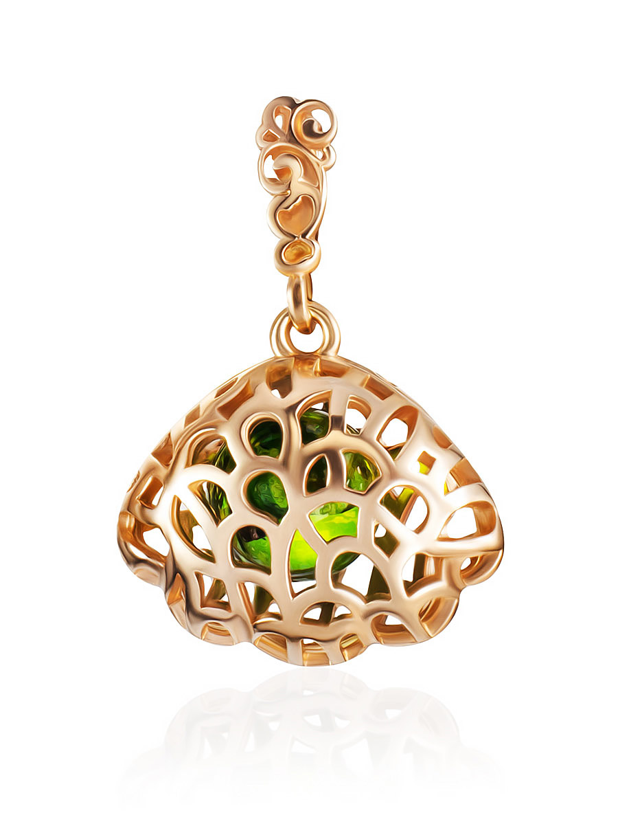 Красивый позолоченный кулон «Ракушка» с тонированным изумрудным янтарём