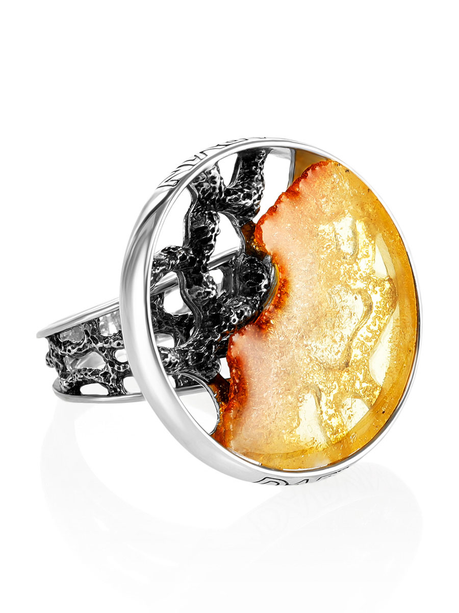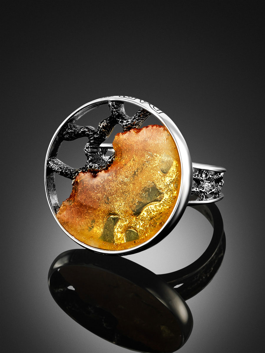 Кольцо создано вручную из цельного кусочка прозрачного золотистого янтаря, вставленного в крупную круглую оправу из ажурного чернёного серебра._x000D_