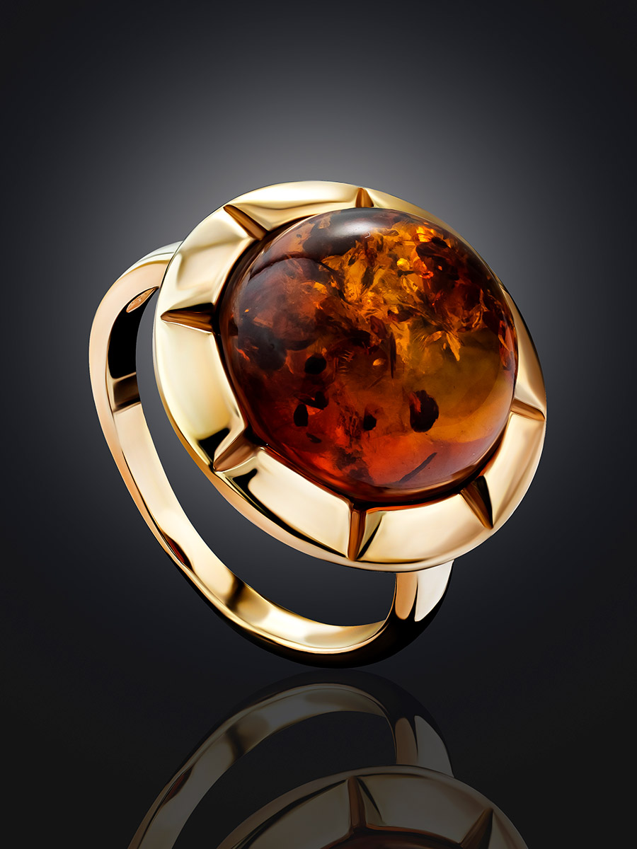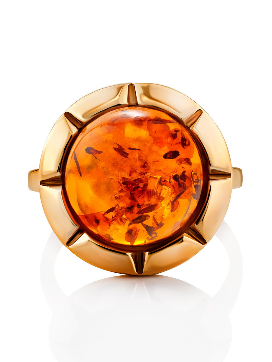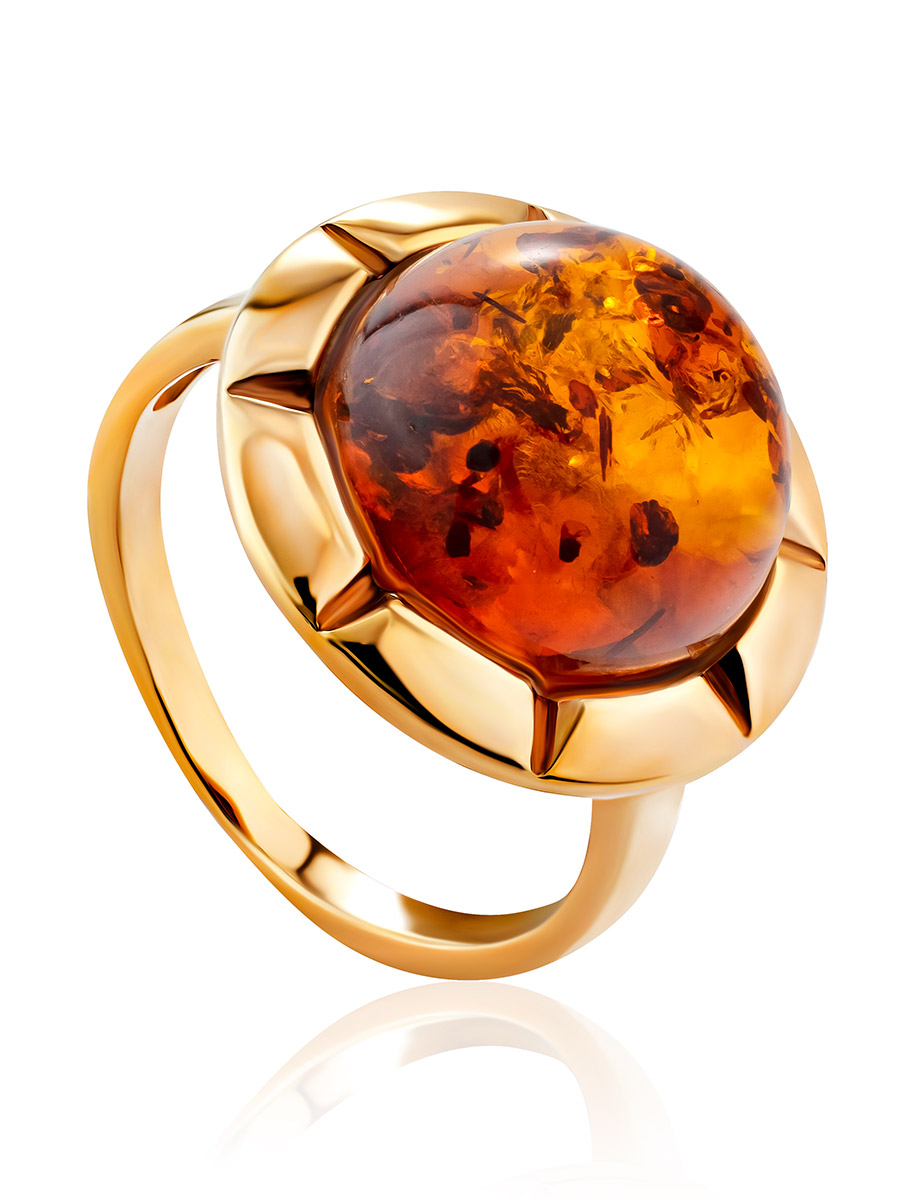 Круглое кольцо с натуральным искрящимся янтарём «Камелия»