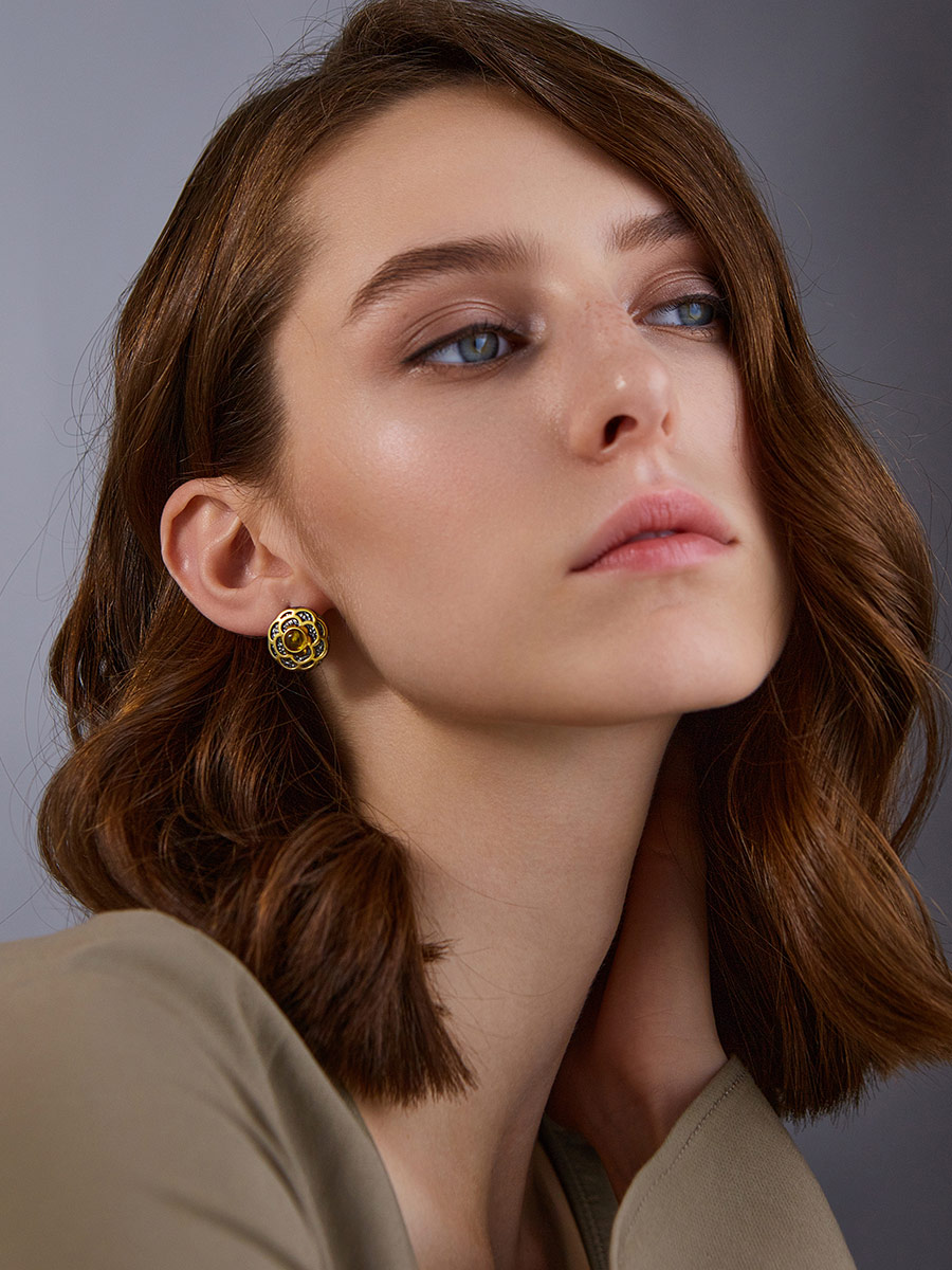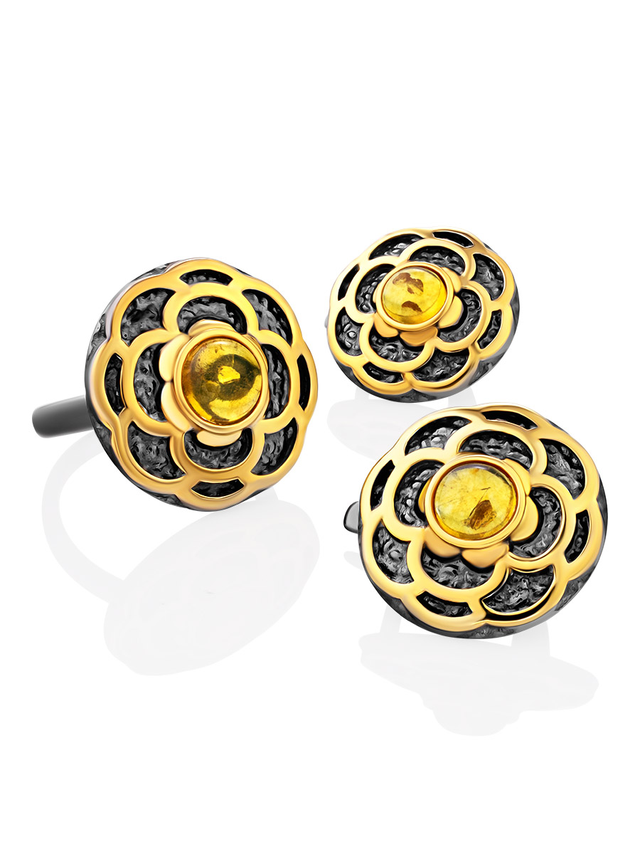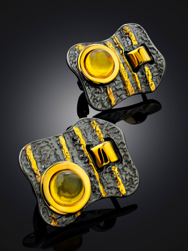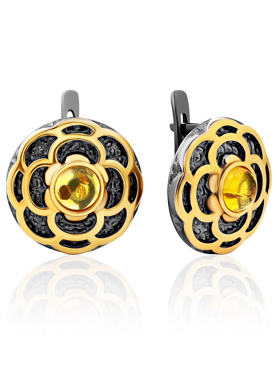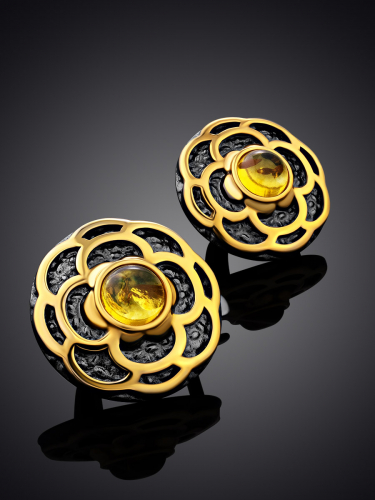 Круглые серьги с чернением и золочением, украшенные янтарём «Гербера»