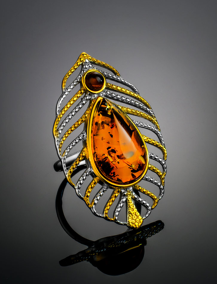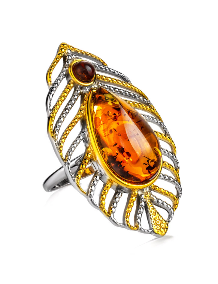 Крупное ажурное кольцо «Павлин»с коньячным янтарём