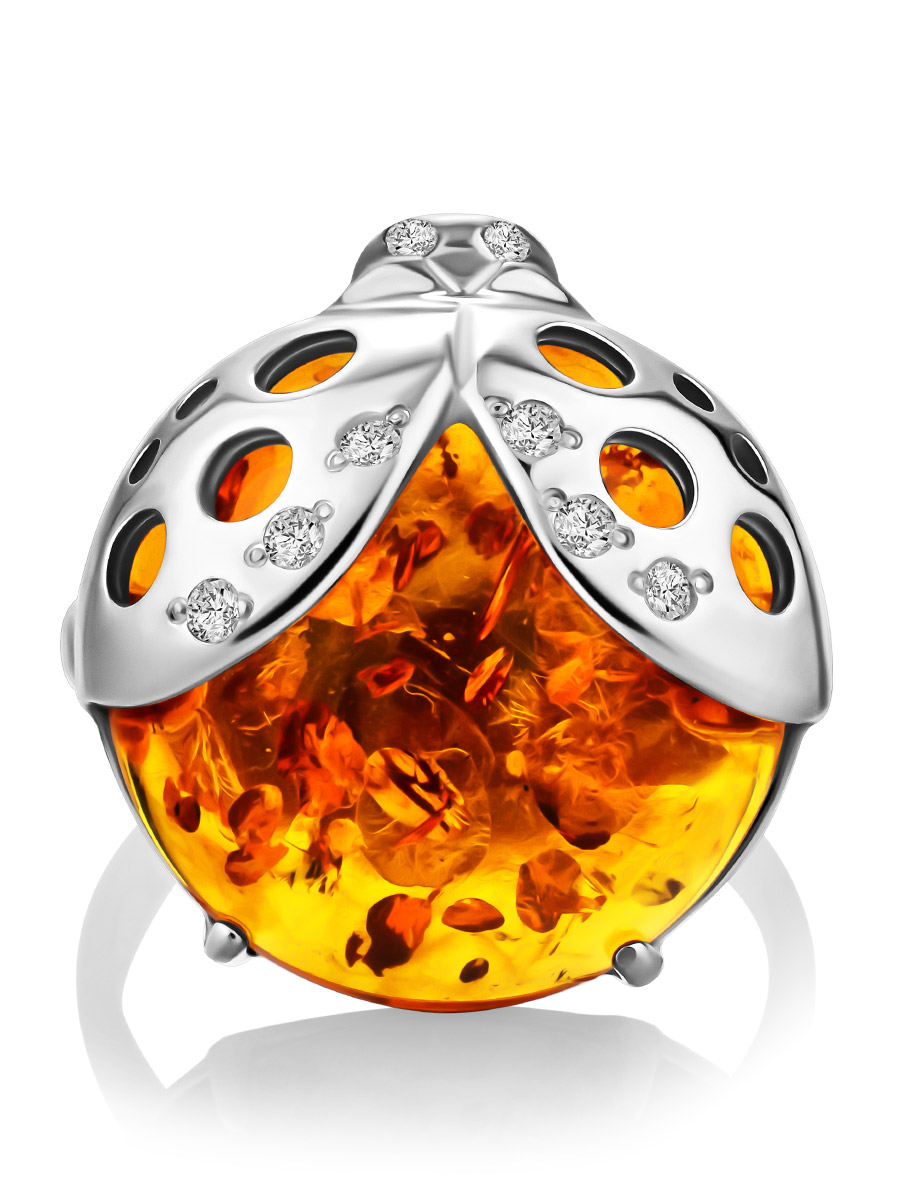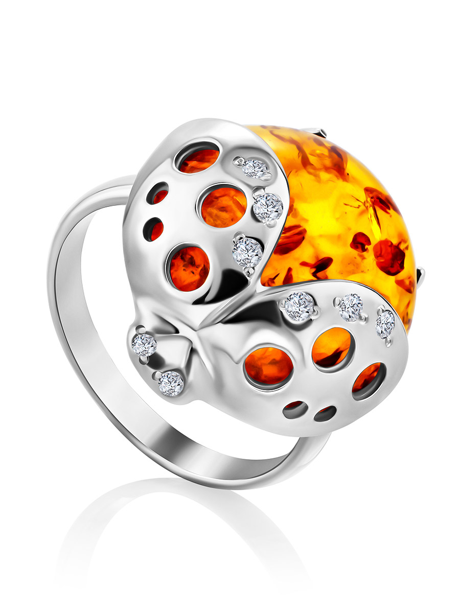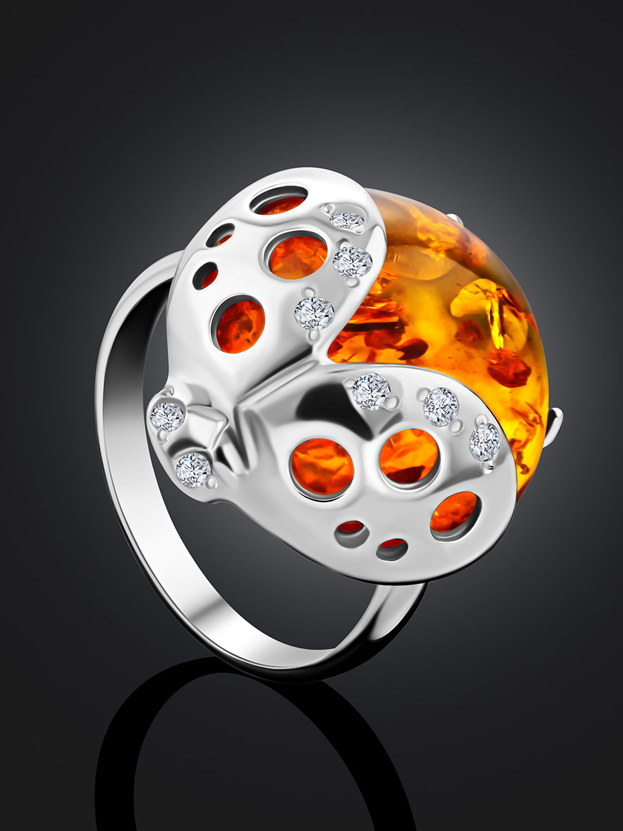 Крупное кольцо из натурального золотистого янтаря «Божья коровка»