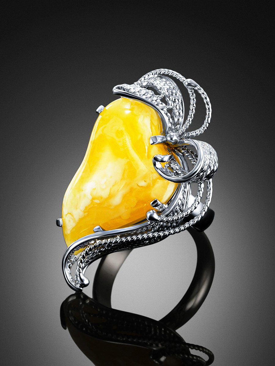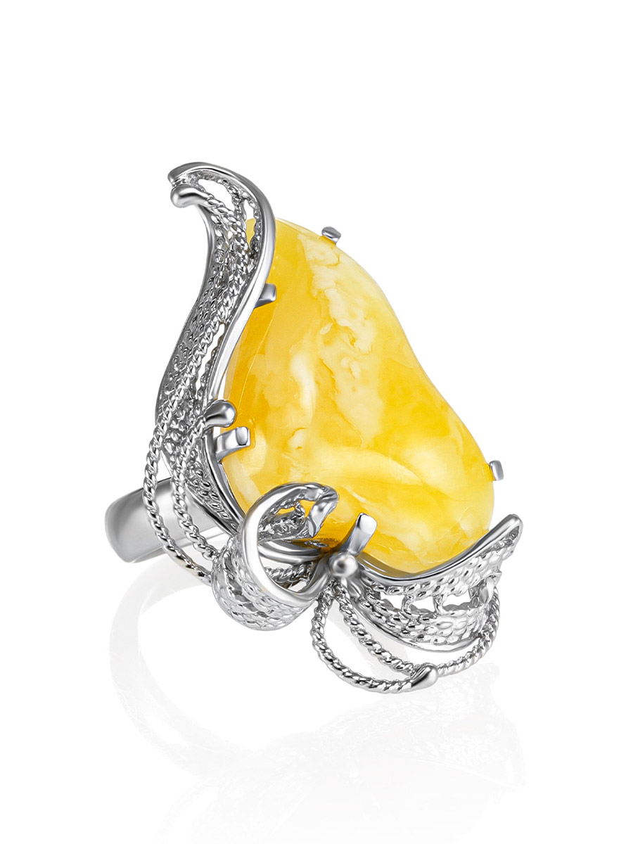 Крупное кольцо с натуральным пейзажно-медовым живописным янтарем «Филигрань»