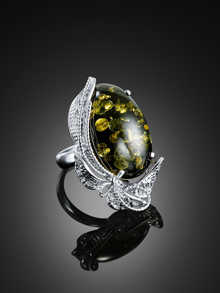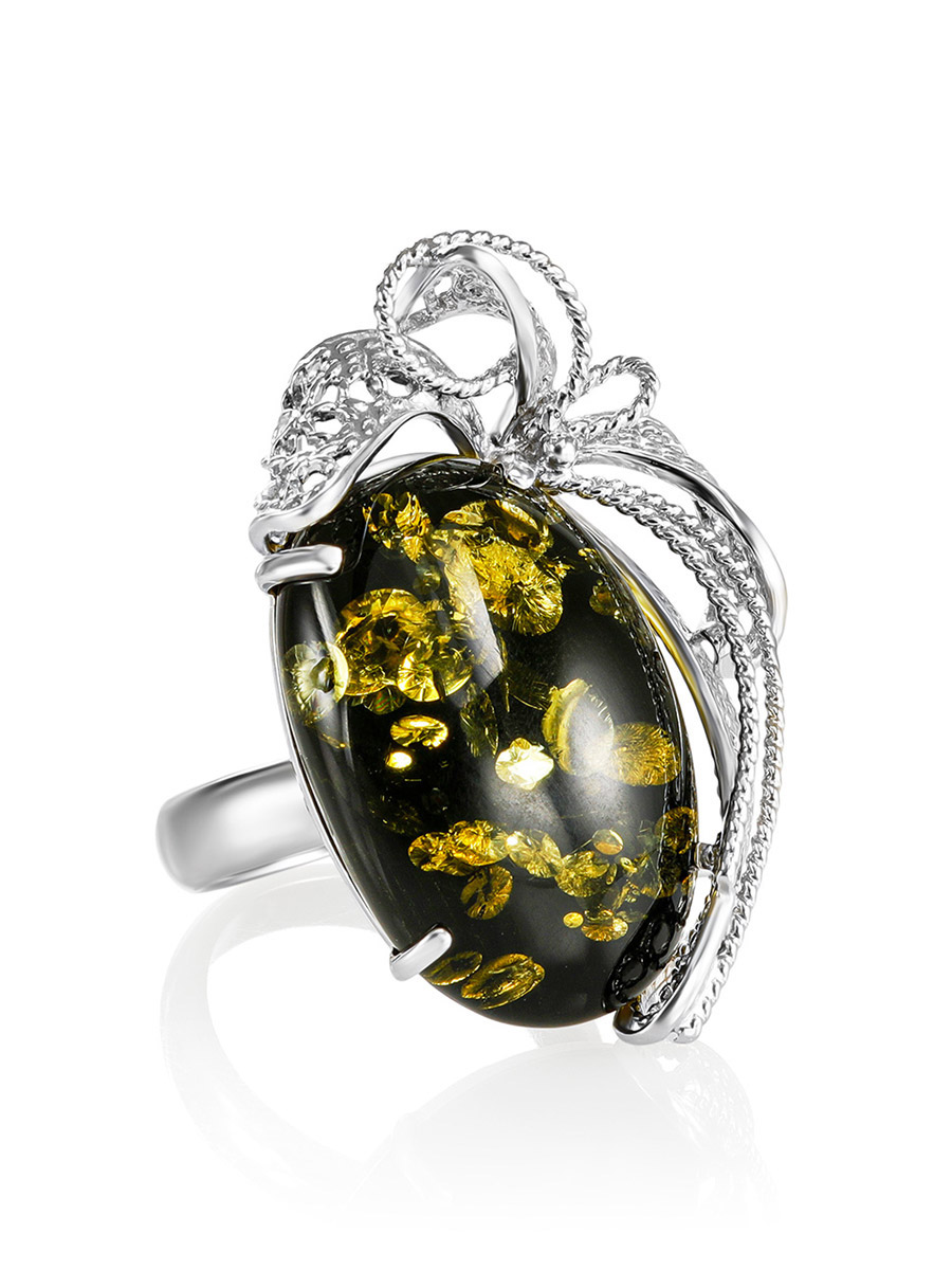 Крупное кольцо с натуральным зелёным искрящимся янтарём «Филигрань»