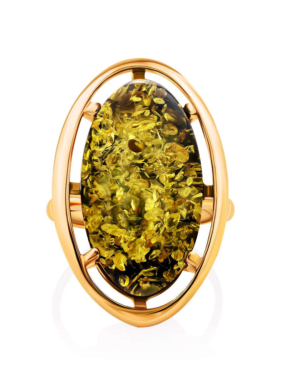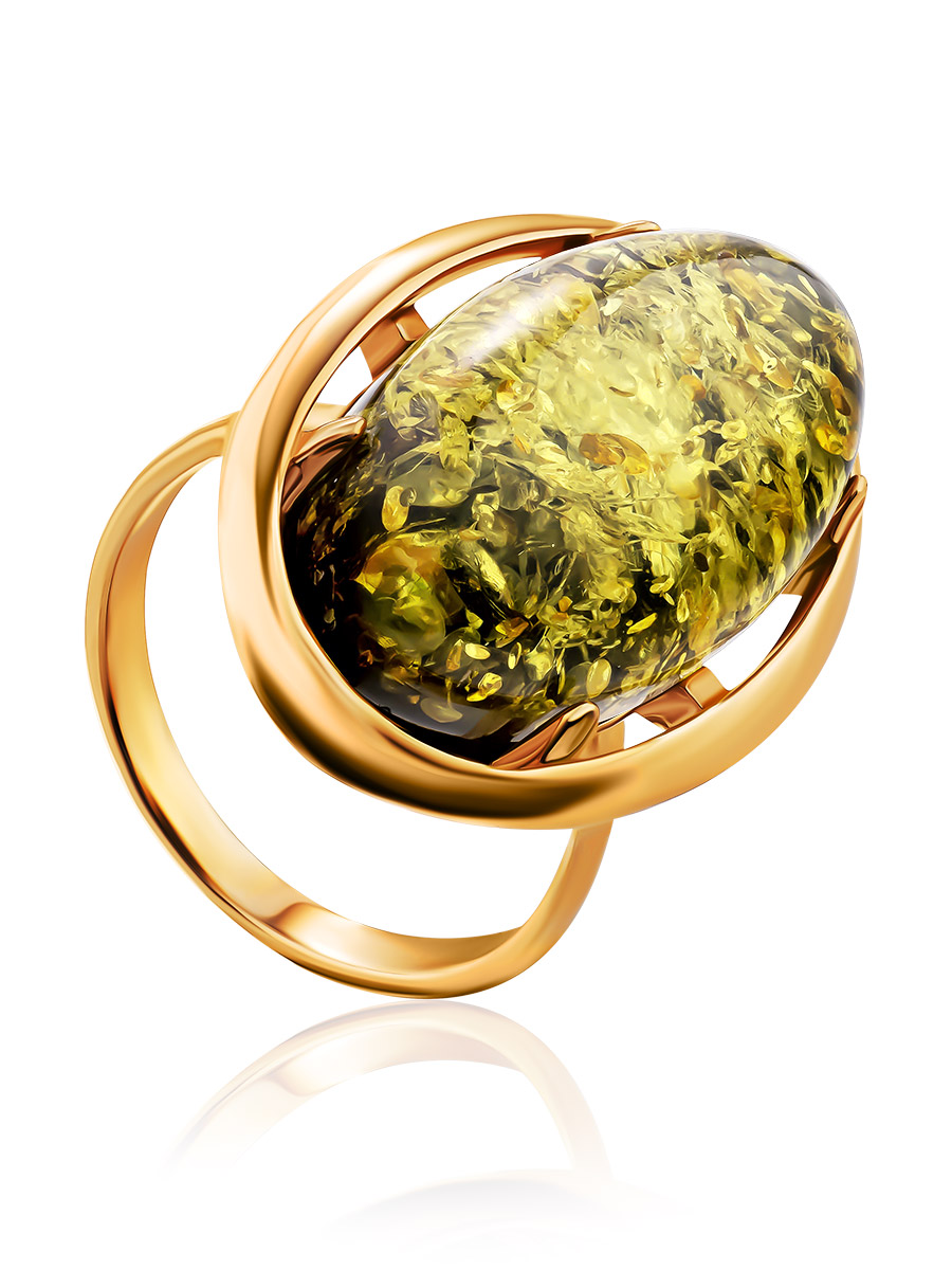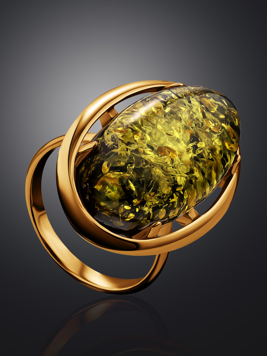 Крупное яркое кольцо с цельным янтарём зелёного цвета «Элегия»