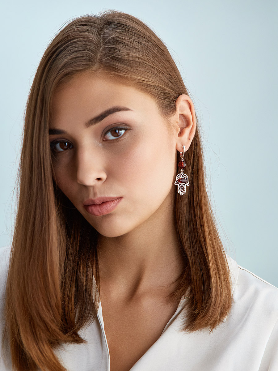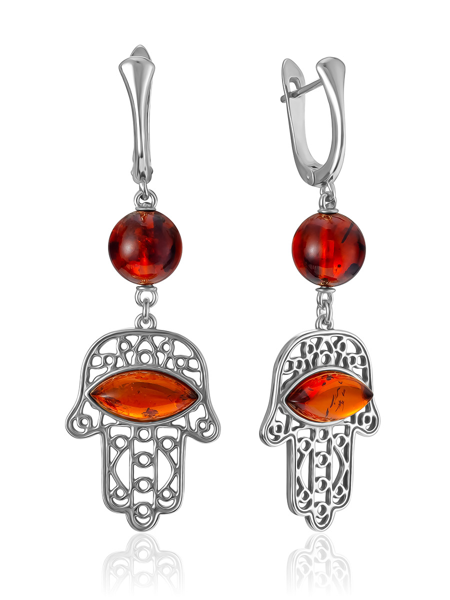 Крупные ажурные серьги с вишнёвым янтарём «Хамса»
