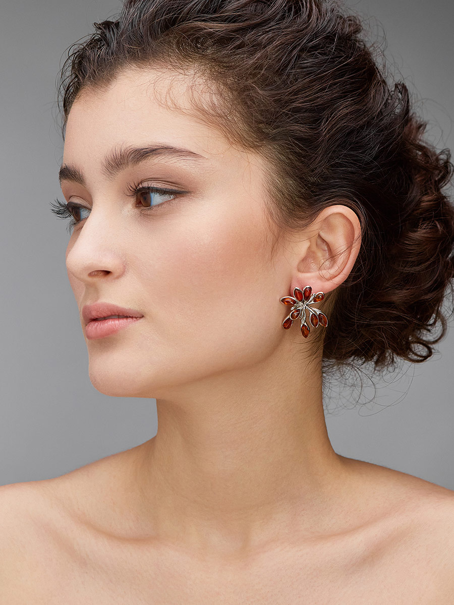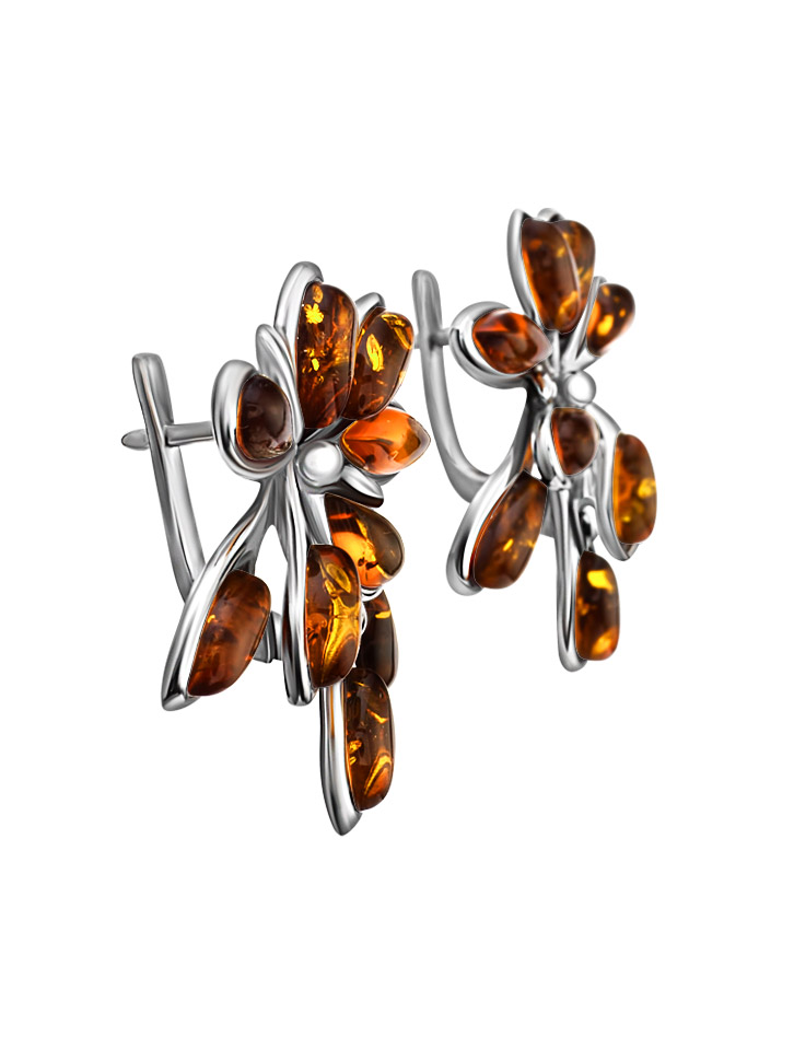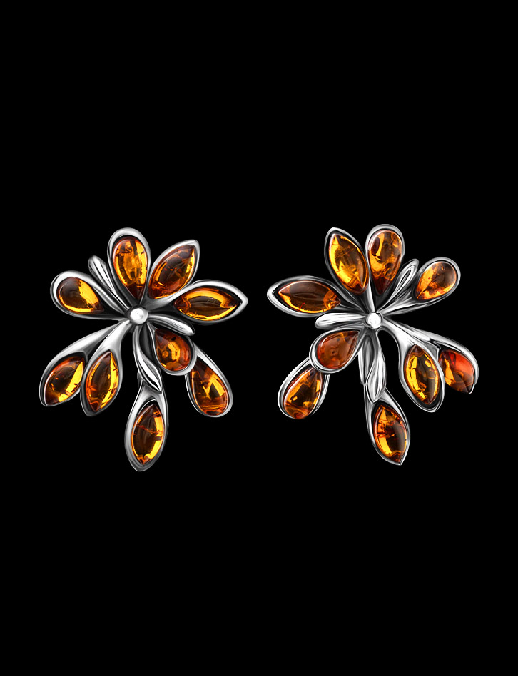 Крупные нарядные серьги из натурального коньячного янтаря «Георгина»