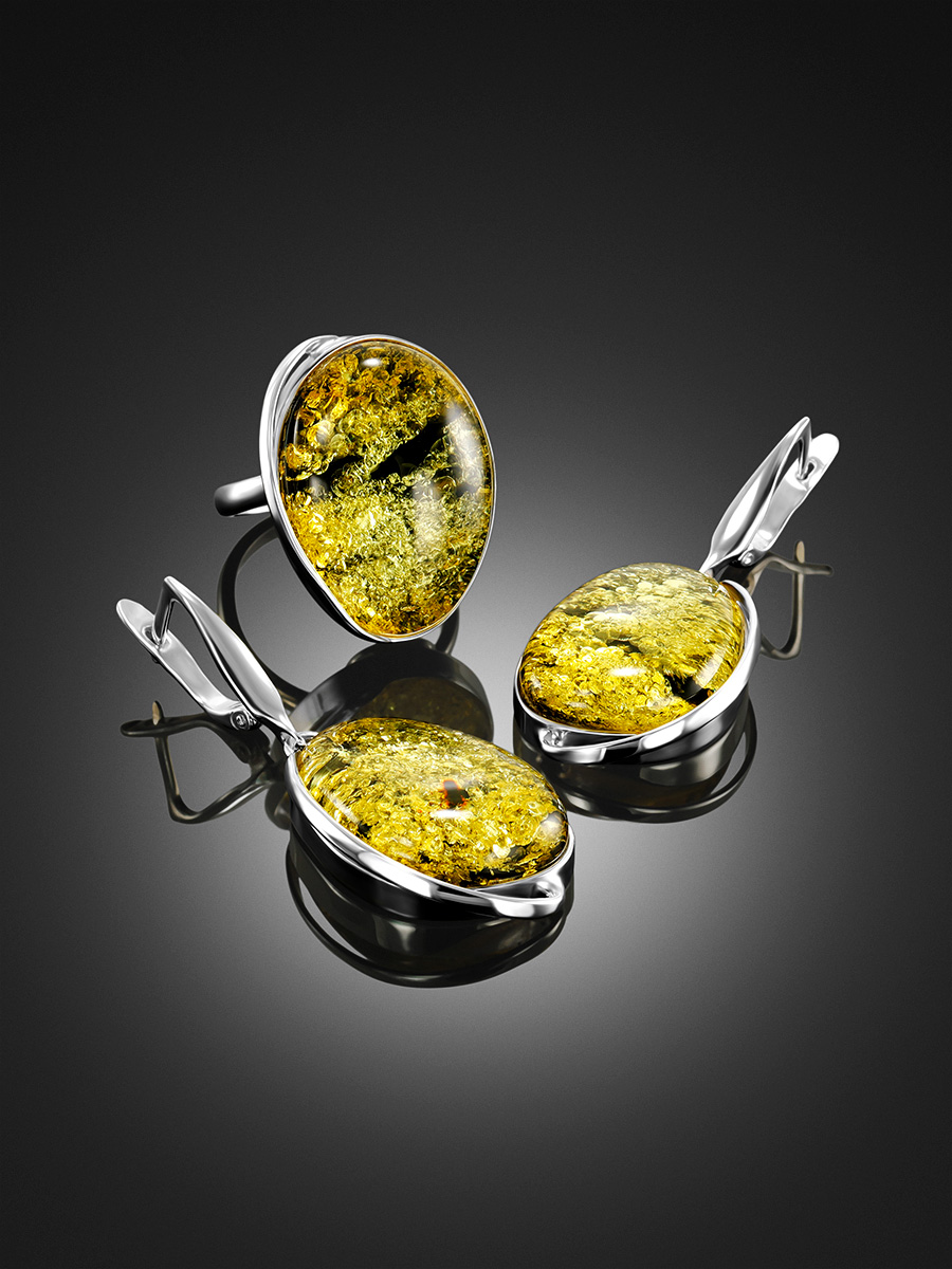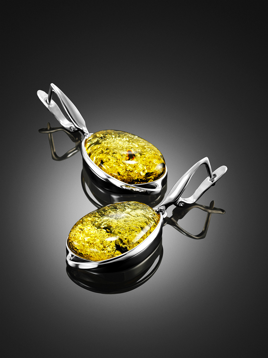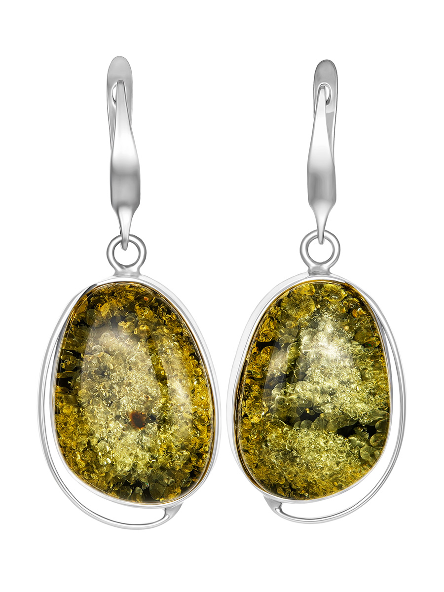 Крупные овальные серьги с натуральным сверкающим янтарем зеленого цвета «Лагуна»