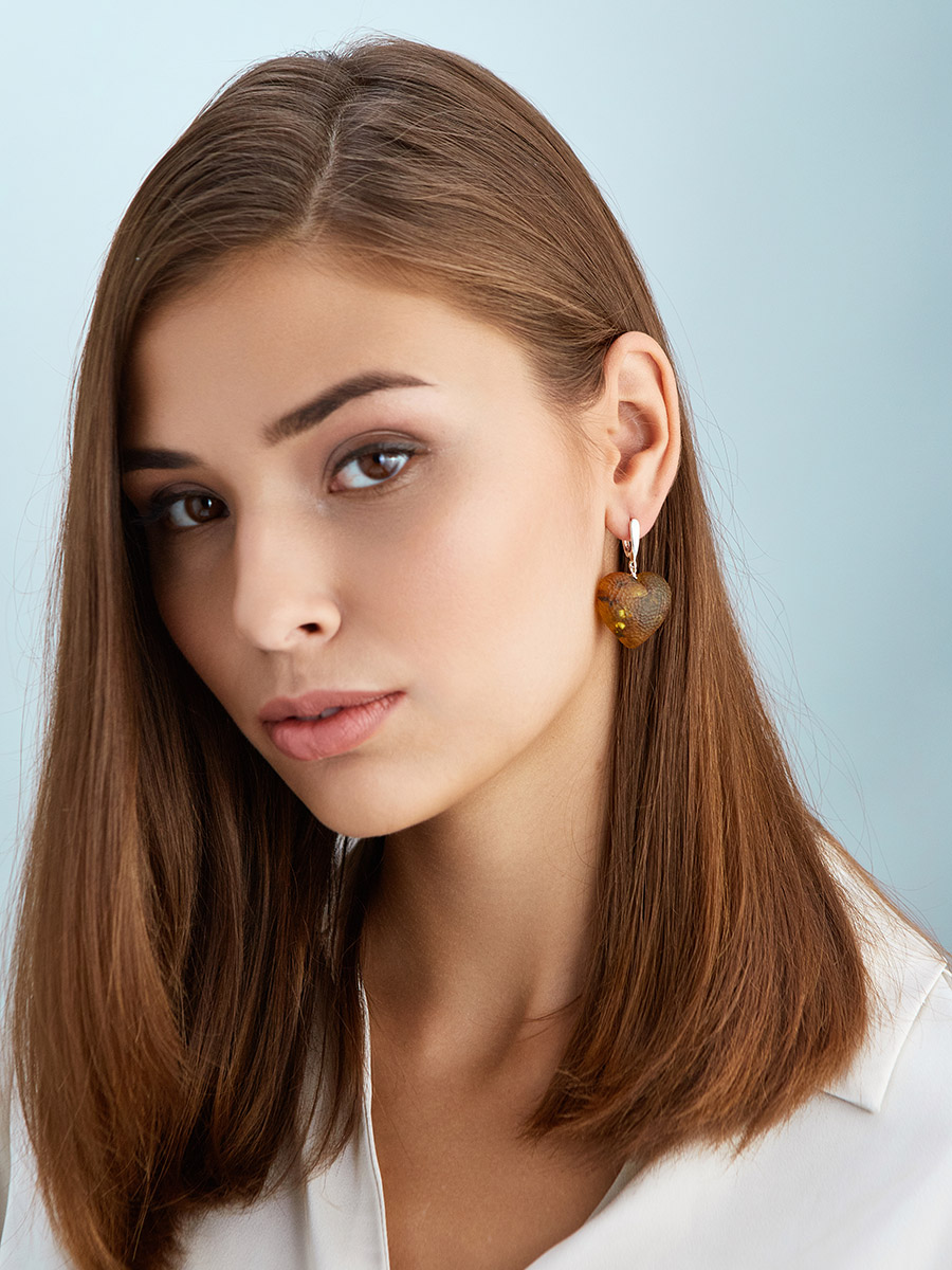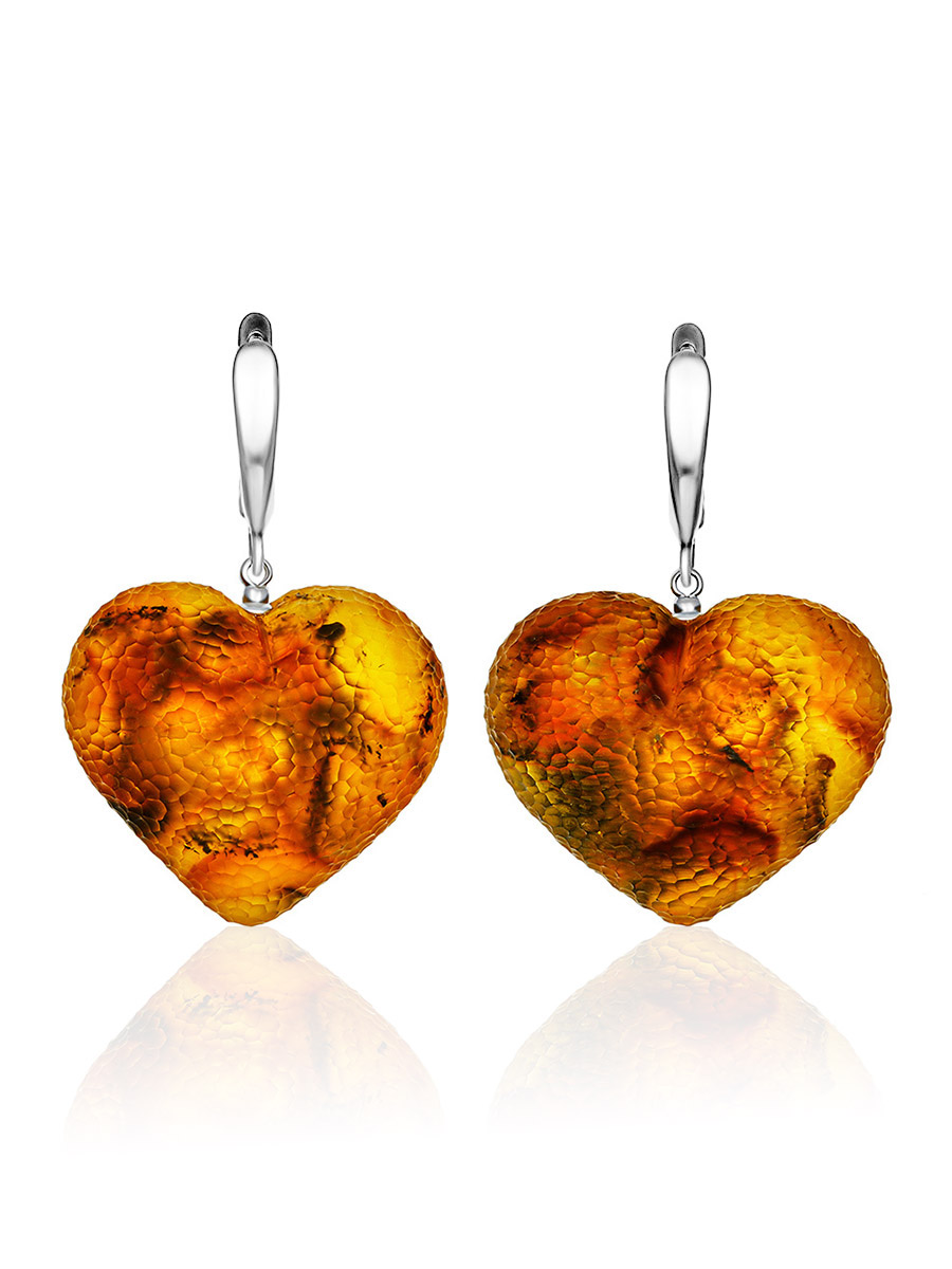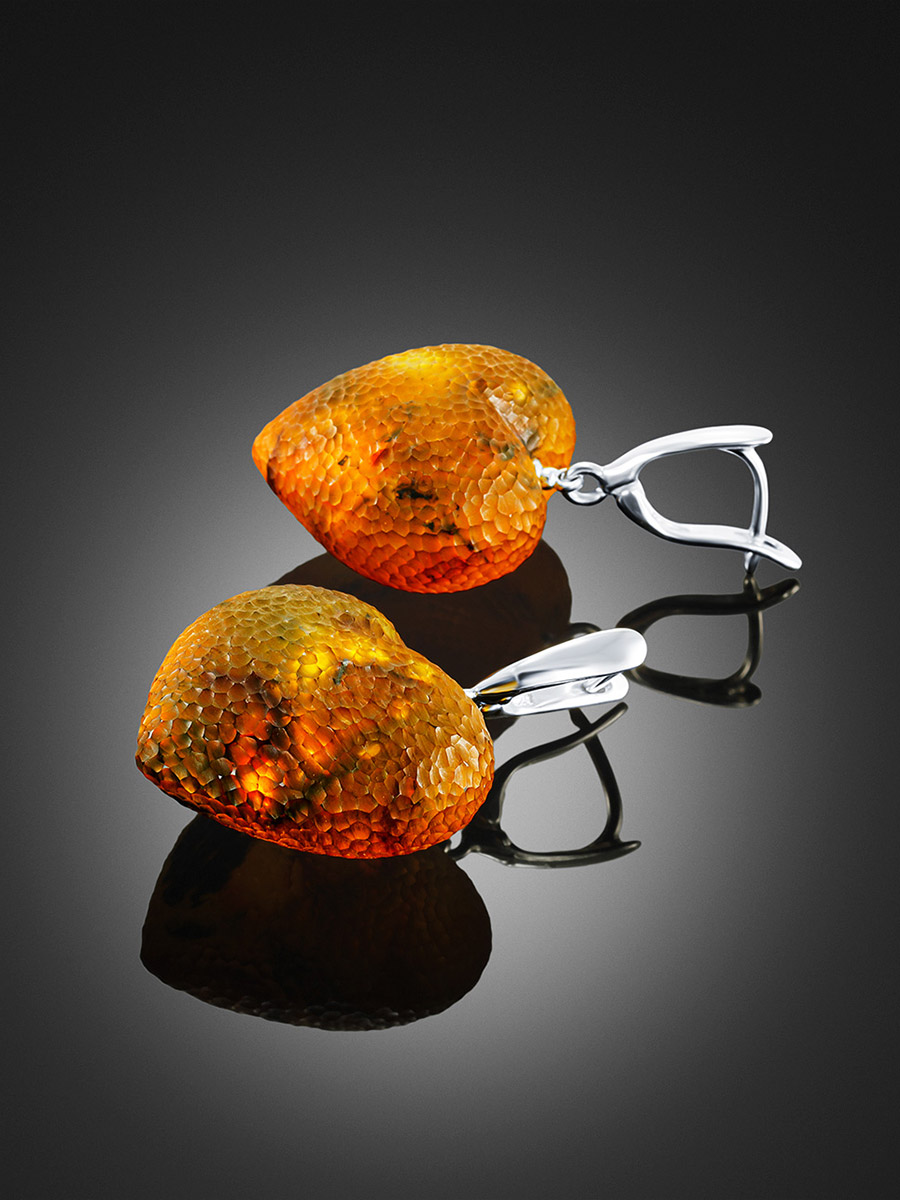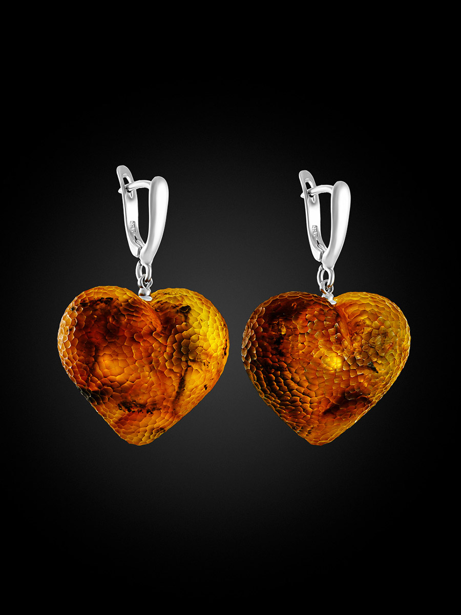 Крупные серьги-сердечки «Марс» из натурального янтаря с «кусаной» текстурой