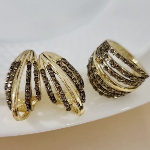 Крупный комплект ювелирной бижутерии Итальянское золото (покрытие желтое 14к) в форме дорожки серьги и кольцо 18 р, вставка: фианиты, цвет: графитовый, Уценка, арт.08.2145