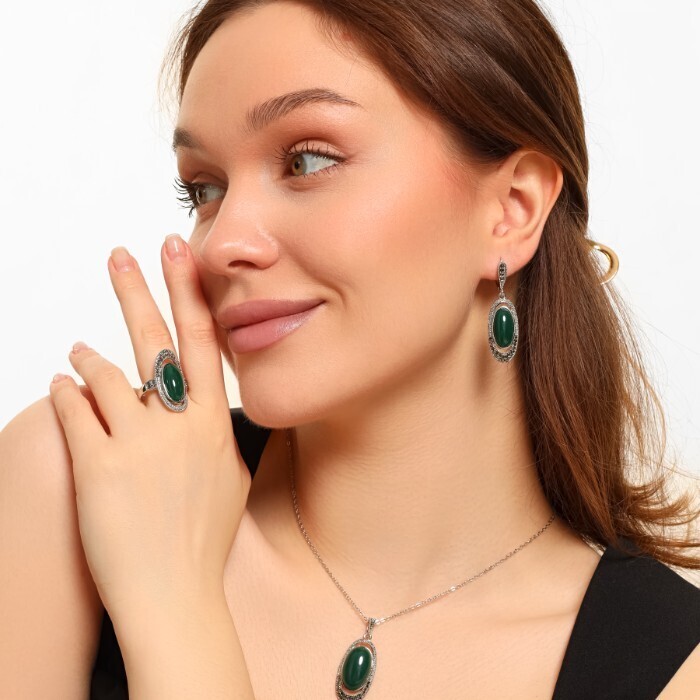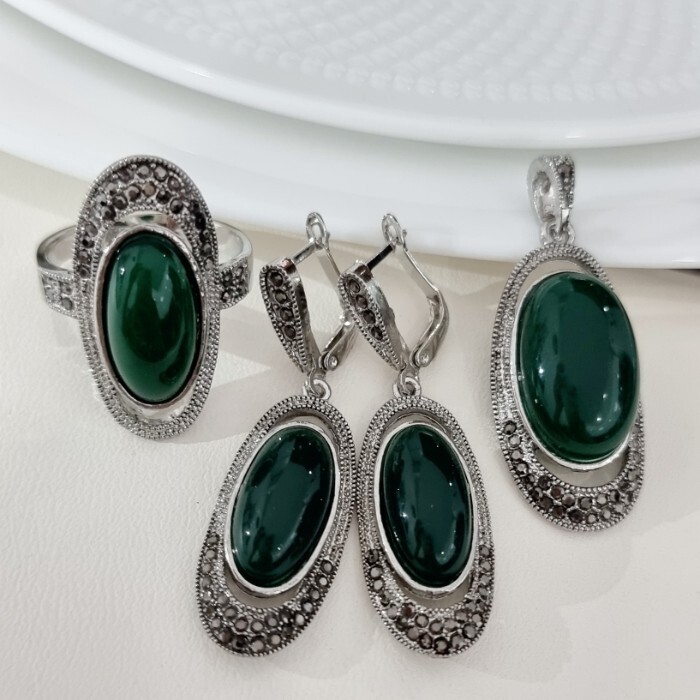 Описание Уценка! Серьги и кольцо, нет кулона. Небольшое, светлое пятно на камне одной серьги. Размер серьги: 4,7*1,3 см. Замок: английский. Размер кулона: 4*1,3 см. Вес комплекта: 22 гр.