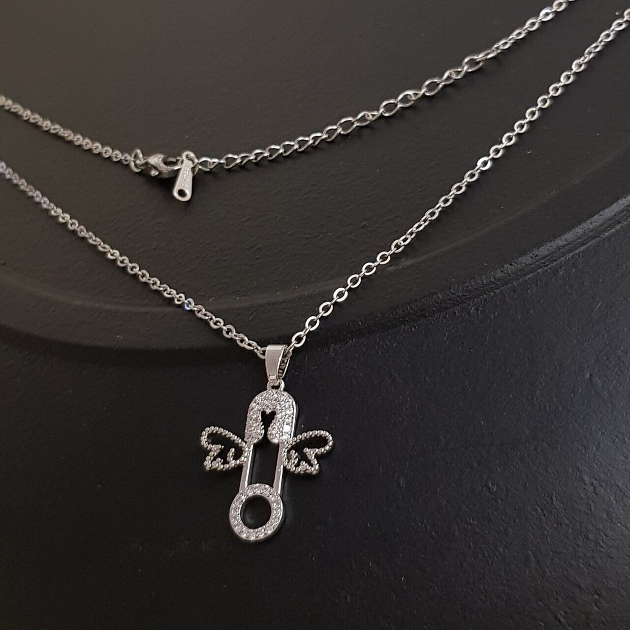 Описание Размер цепочки с кулоном: 46,5 ( +6 )*0,1 см. Размер кулона: 2,5*1,8 см. Вес: 6 гр. Покрытие посеребрение. Материал: ювелирная сталь, кристаллы, фианиты.