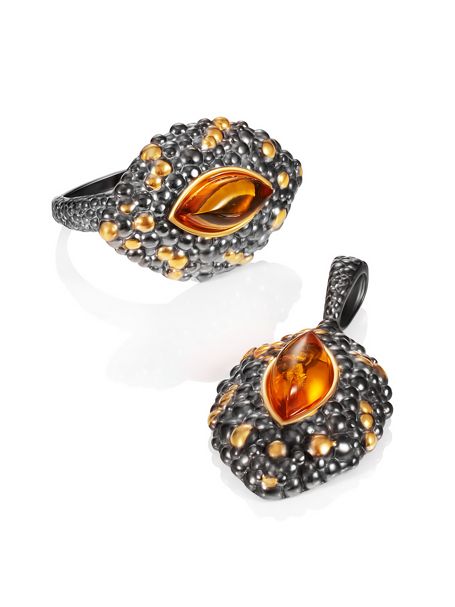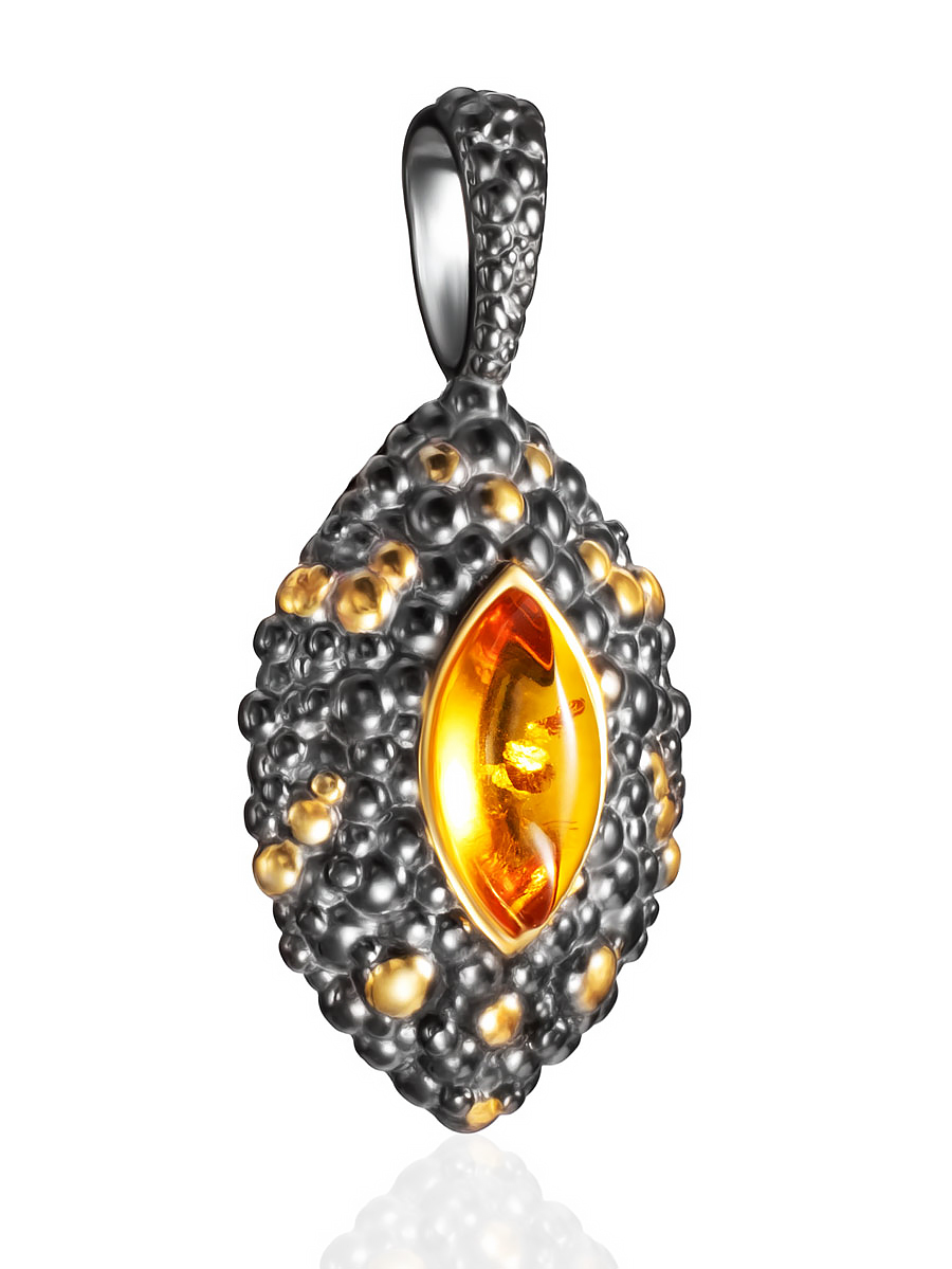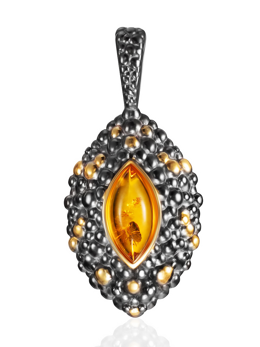 Кулон в чернении и золочении, украшенный коньячным янтарём «Раушен»
