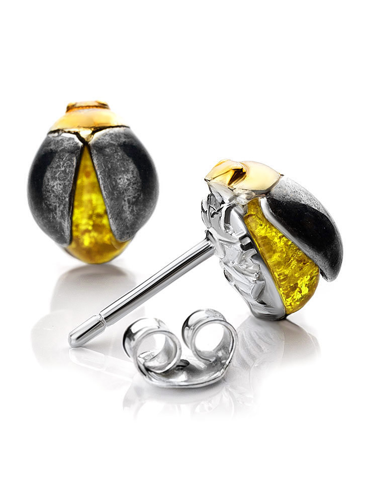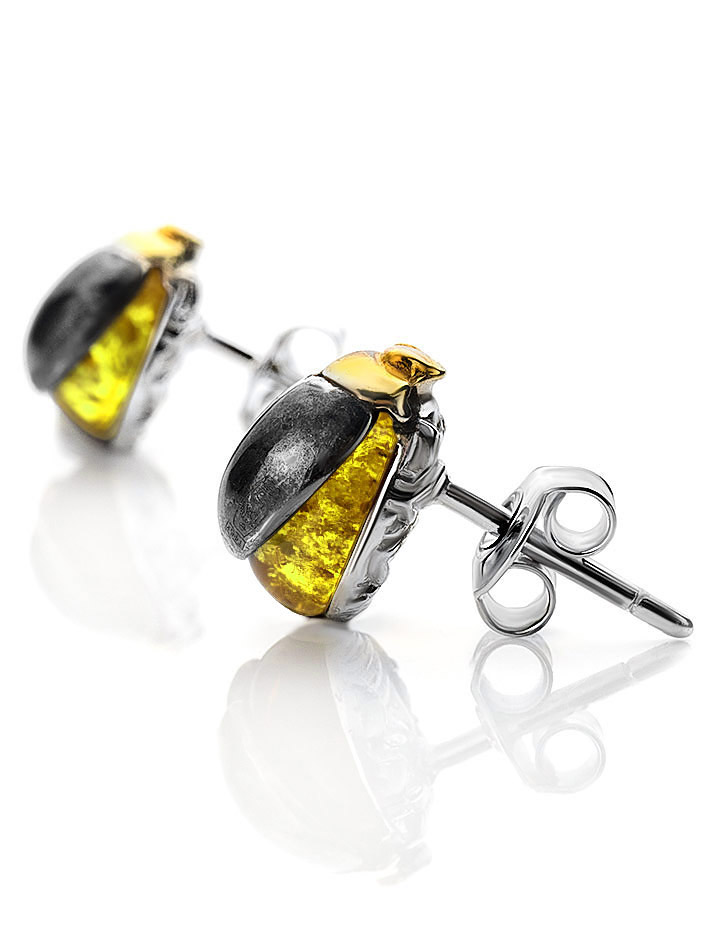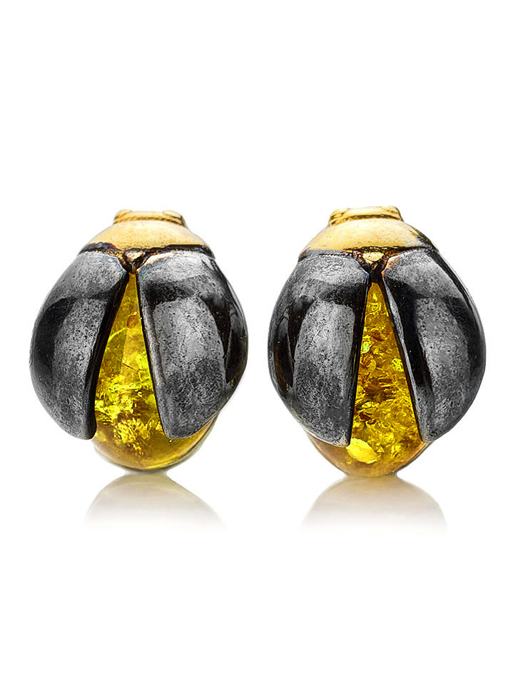 Маленькие серьги-гвоздики «Скарабей» с лимонным янтарём