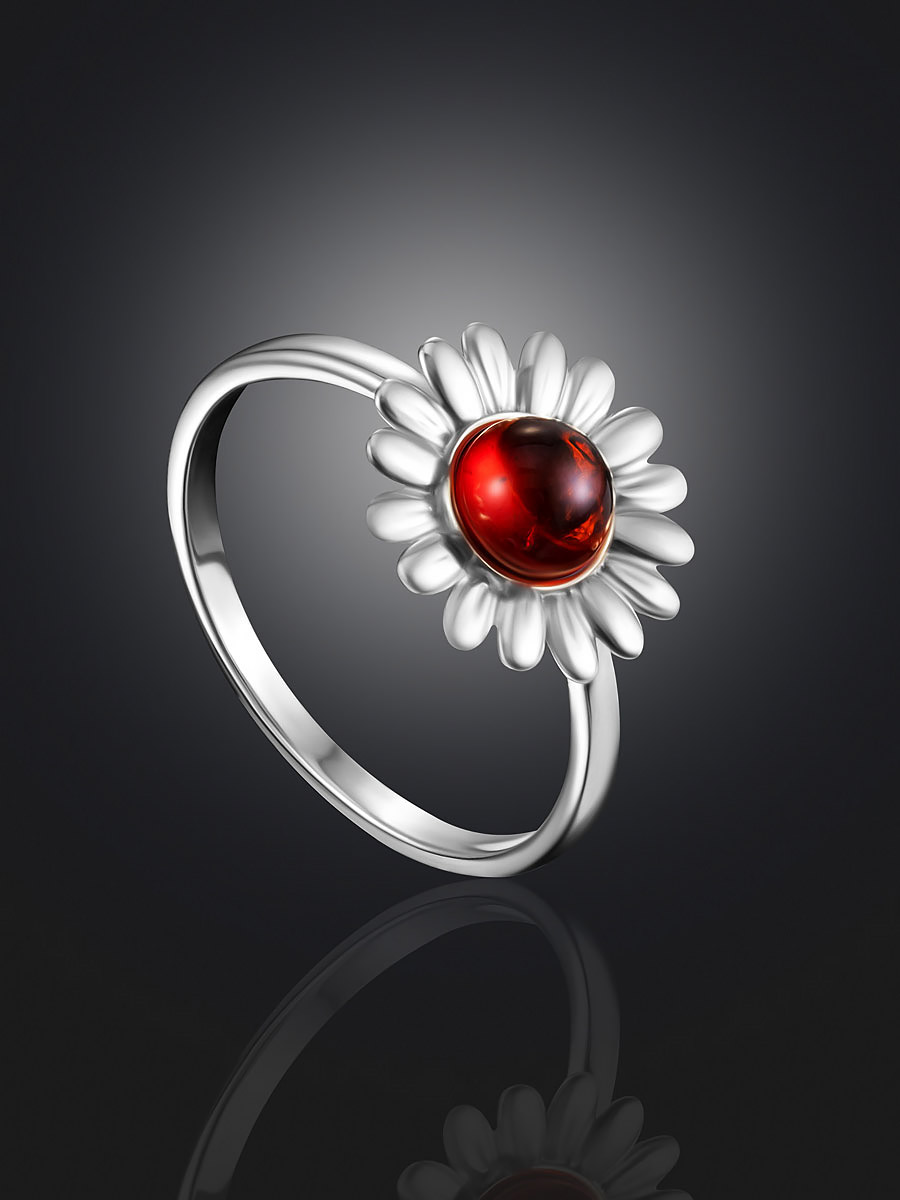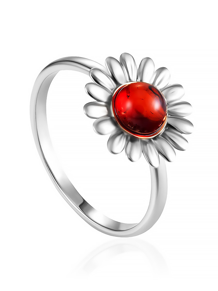 Милое кольцо «Ромашка» с вишнёвым янтарём
