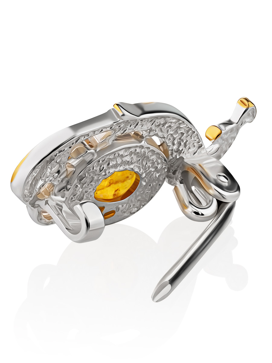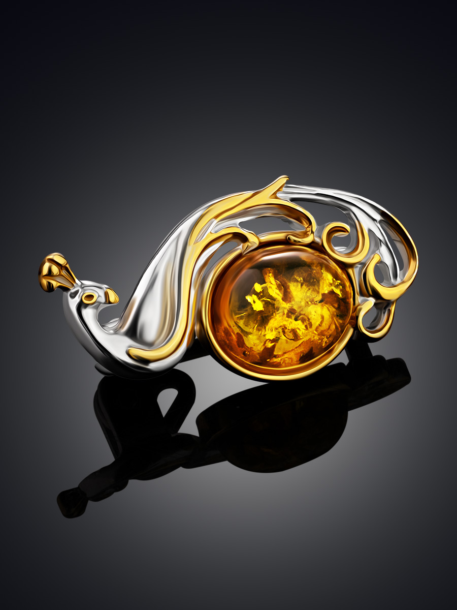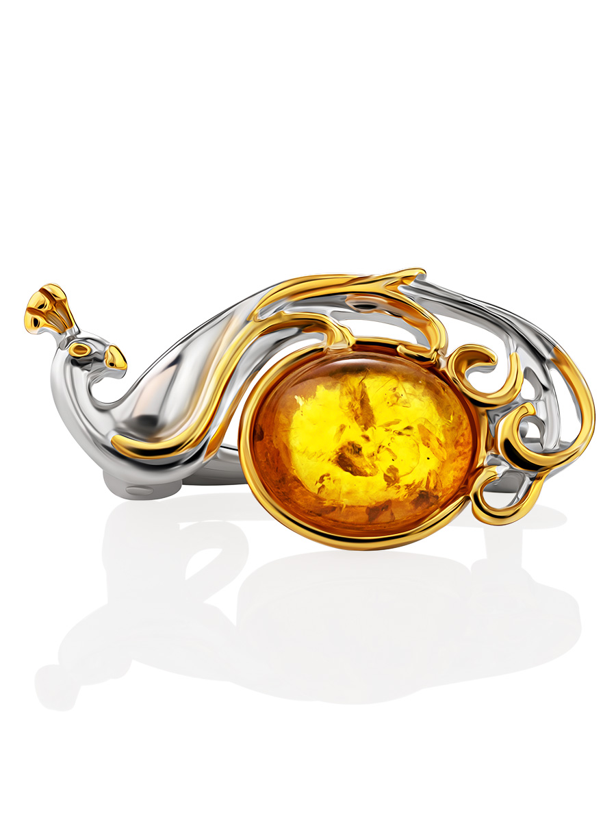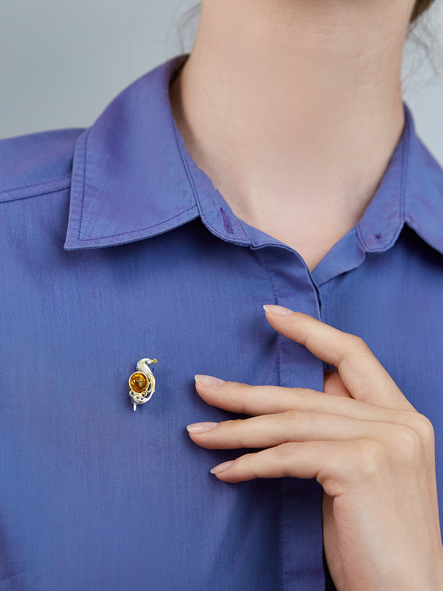 Миниатюрная брошь с золотистым янтарём «Павлин»