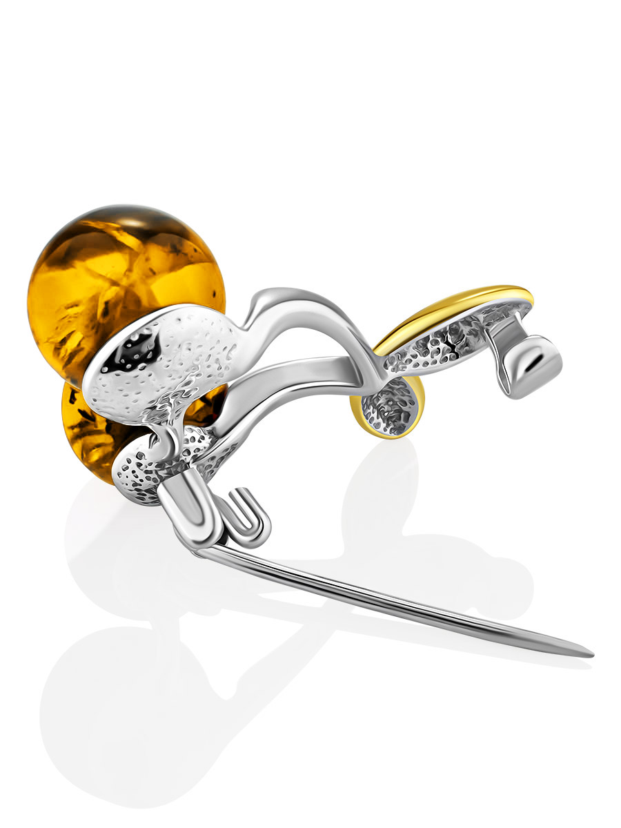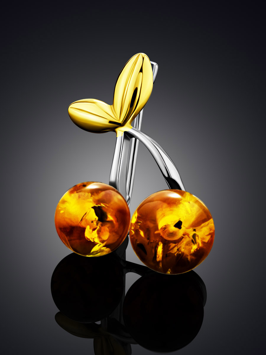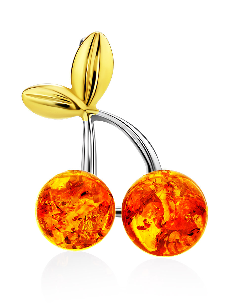 Миниатюрная брошь «Вишенка» из янтаря золотисто-коньячного цвета