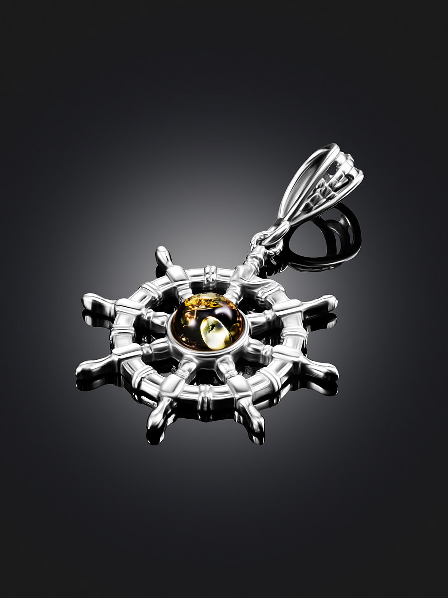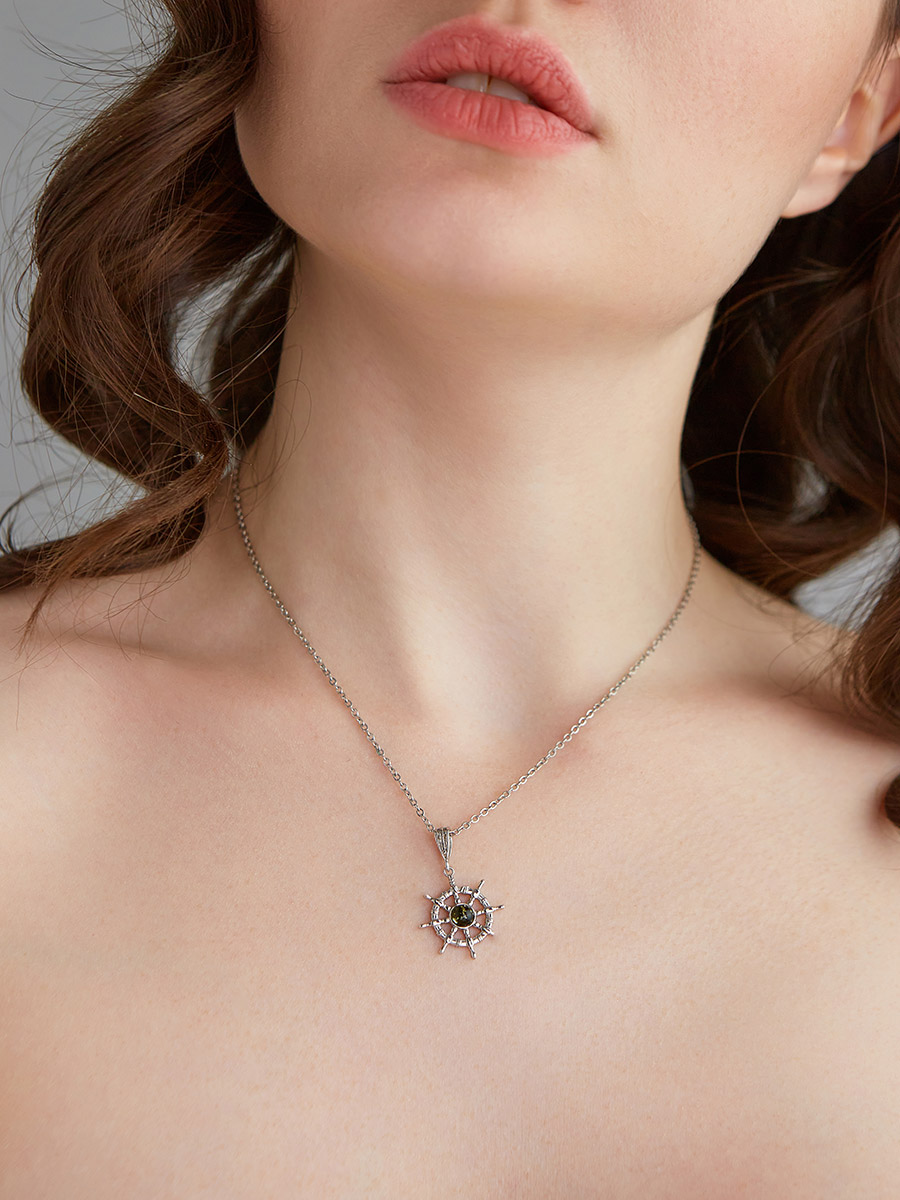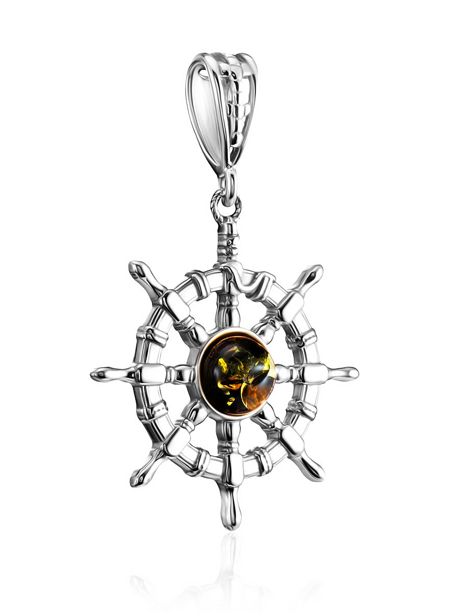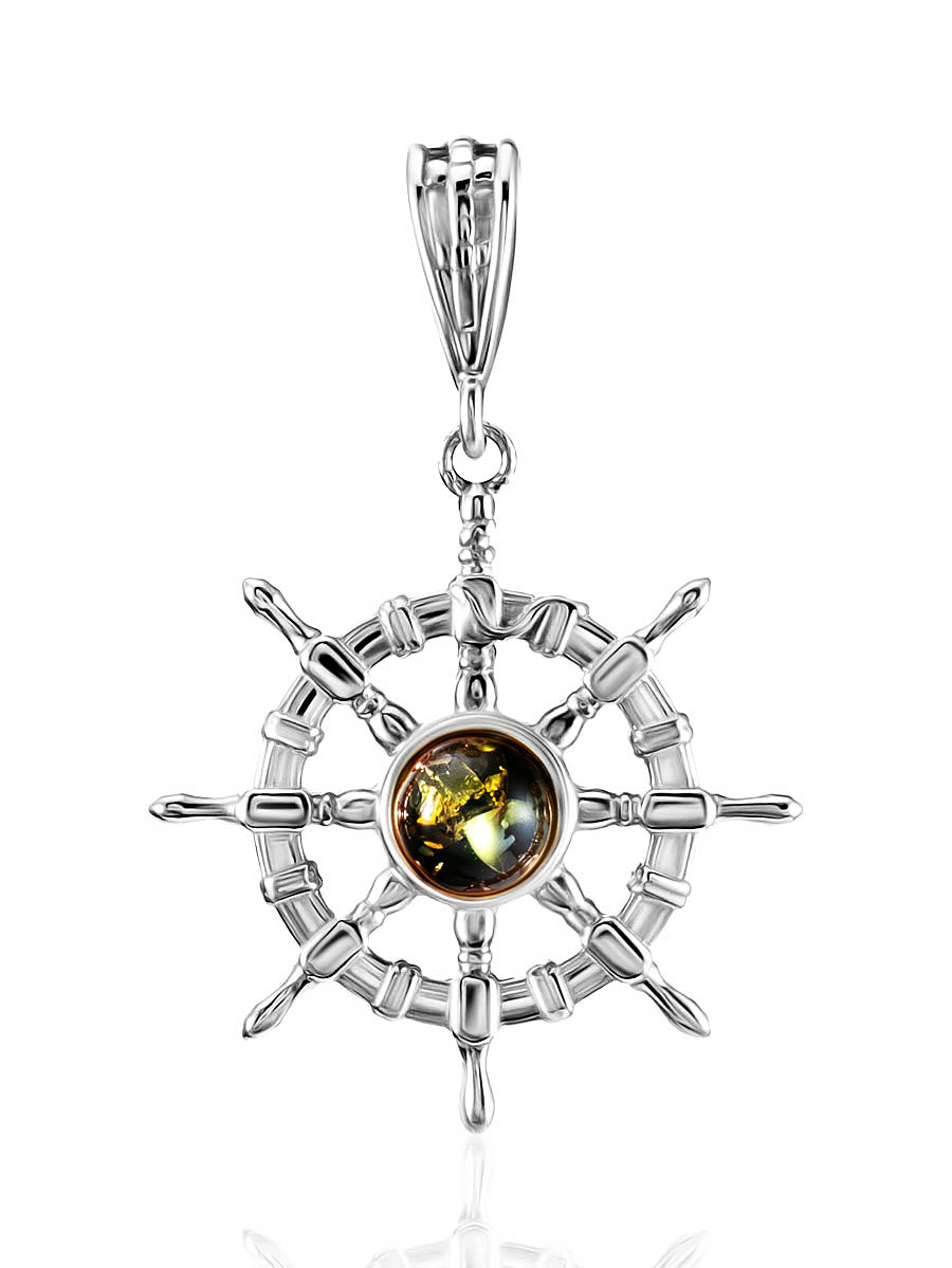 Миниатюрная подвеска «Штурвал» с натуральным янтарём зелёного цвета