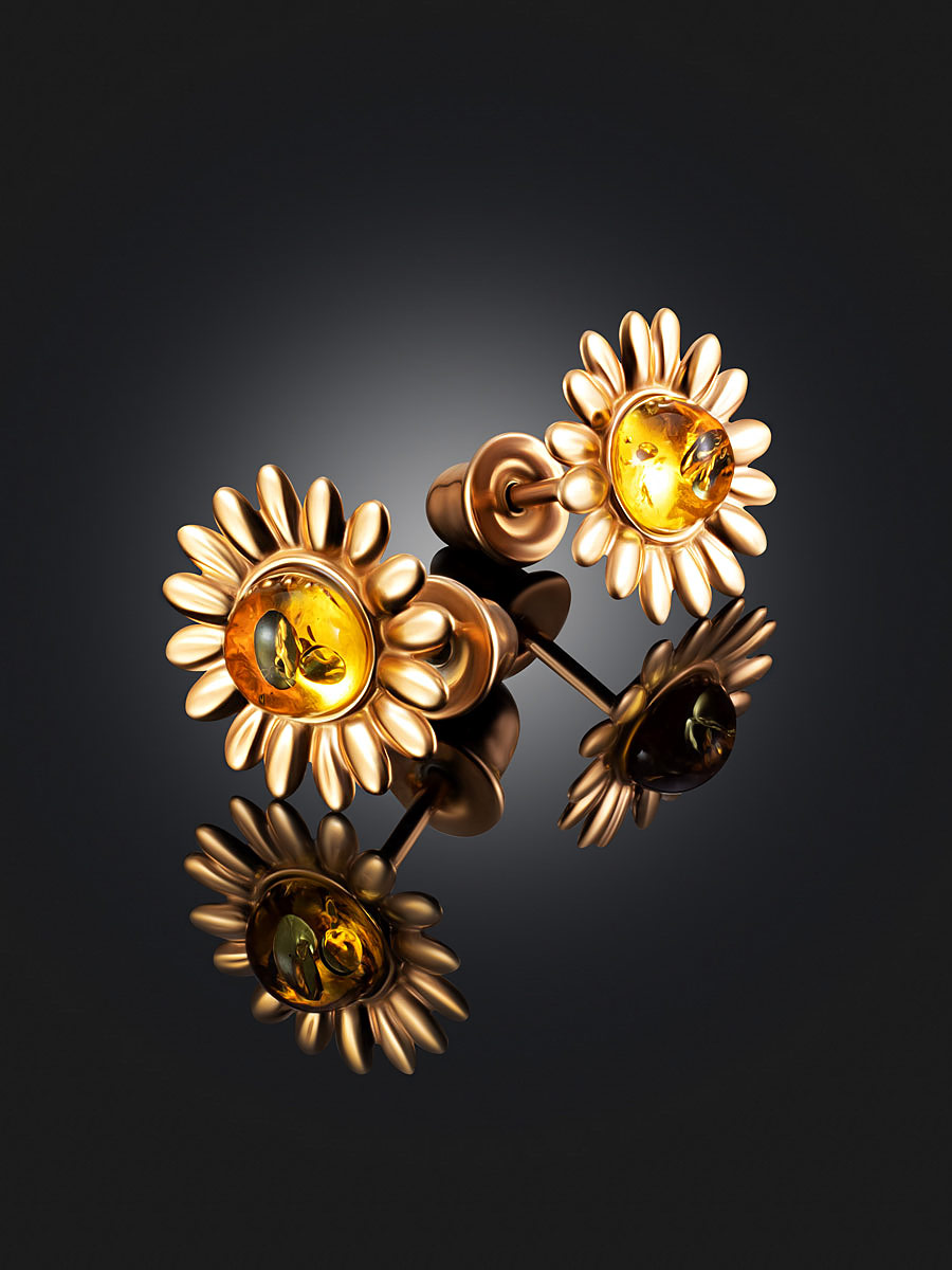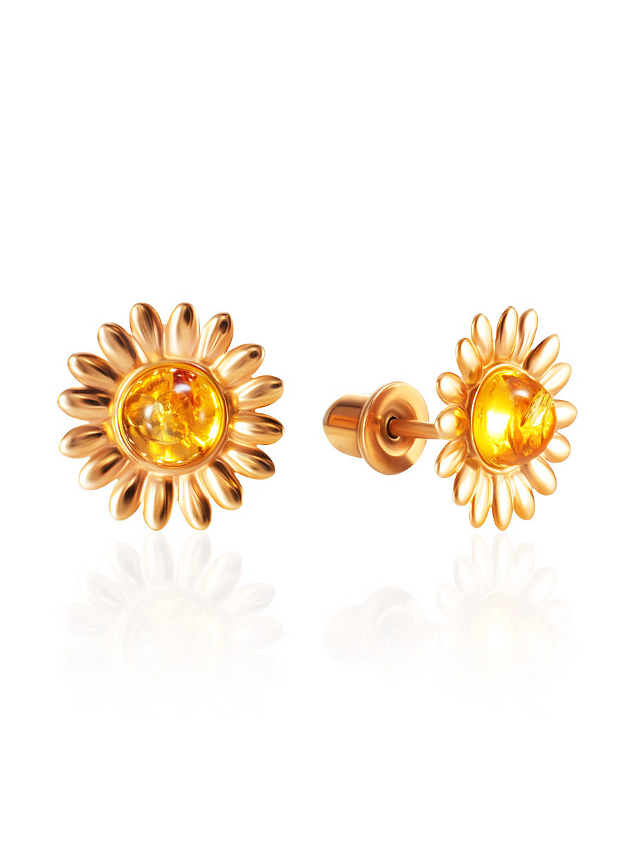 Миниатюрные позолоченные серьги-гвоздики «Ромашка» с лимонным янтарём