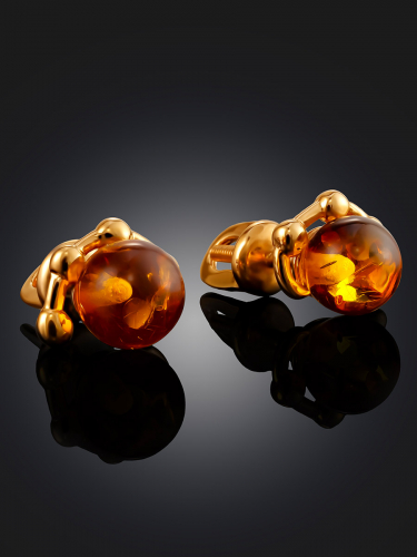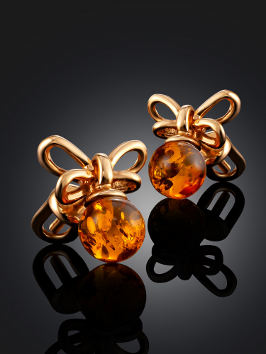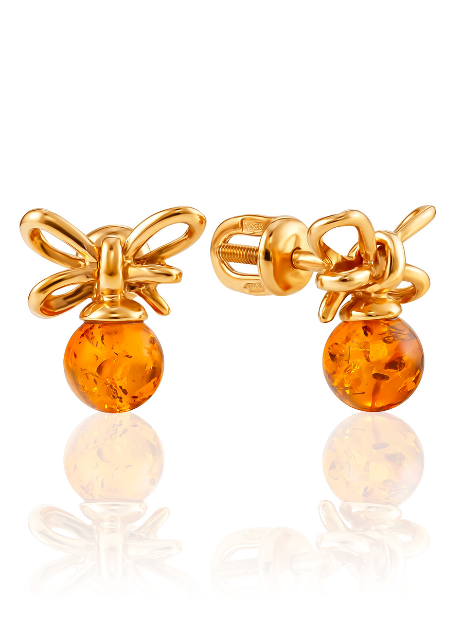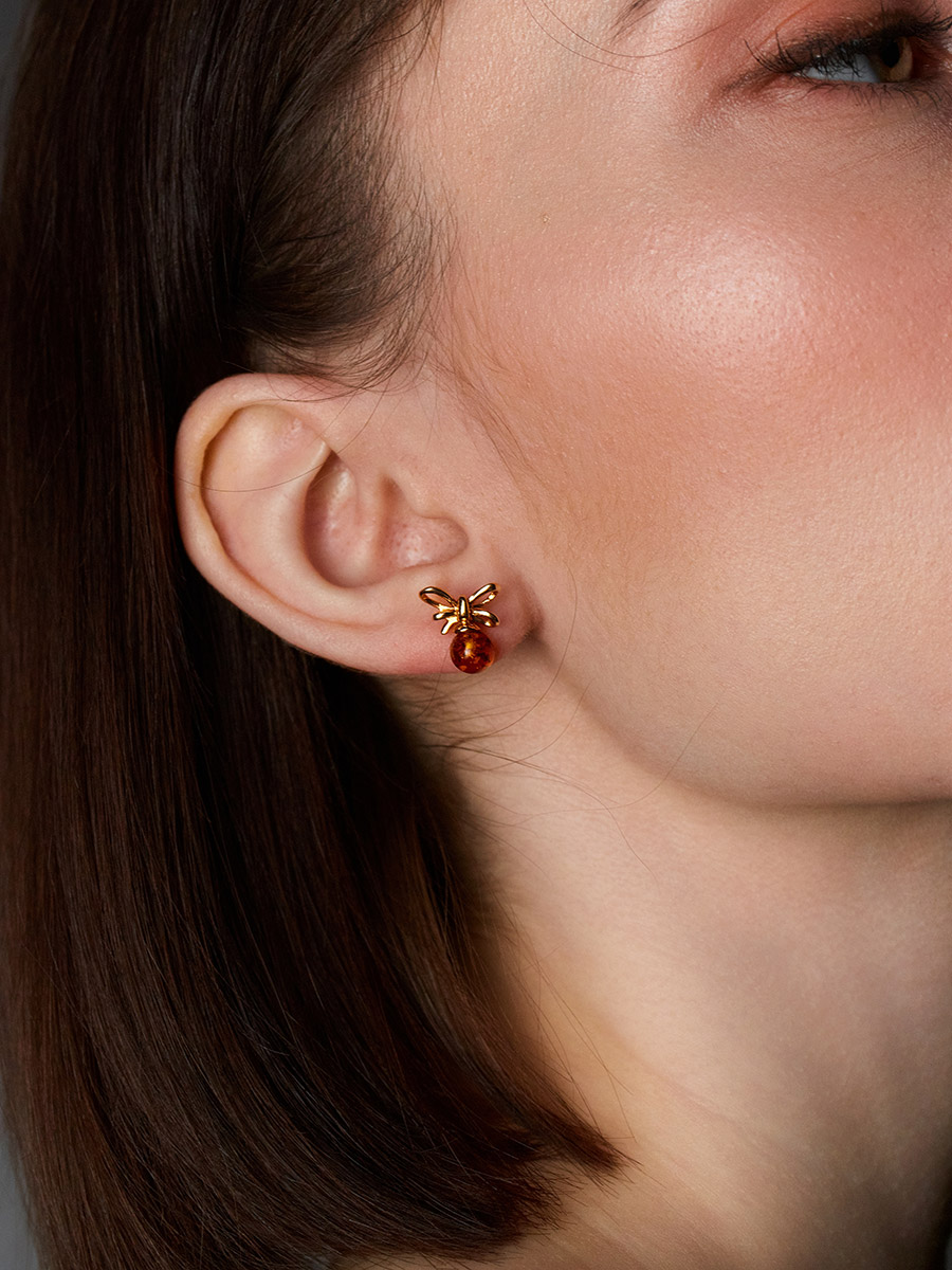 Миниатюрные серьги-гвоздики с натуральным коньячным янтарём «Бантик»