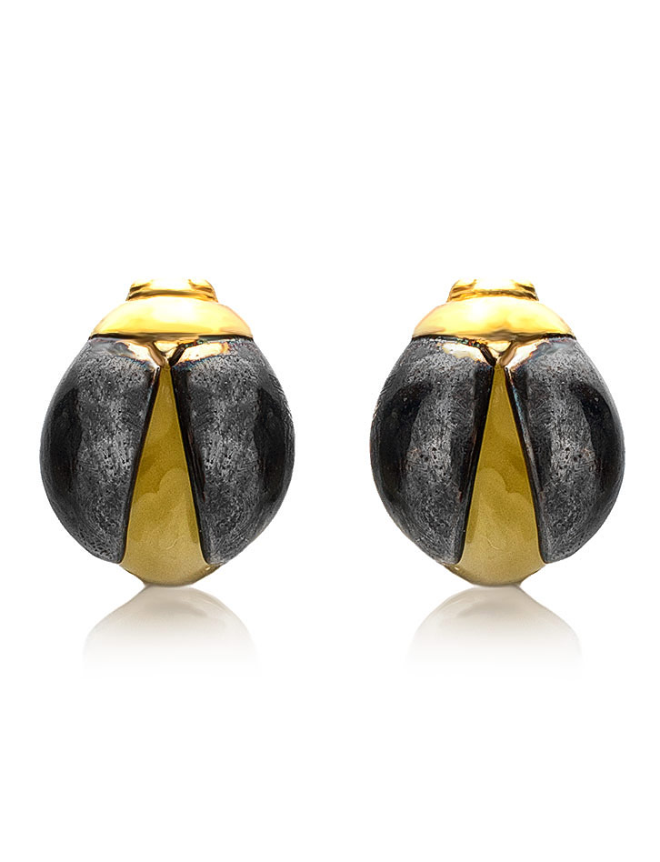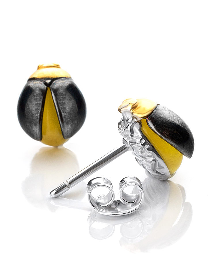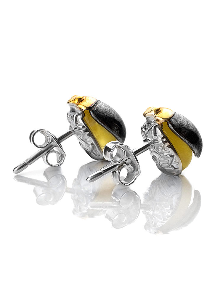 Миниатюрные серьги-гвоздики «Скарабей» с янтарём
