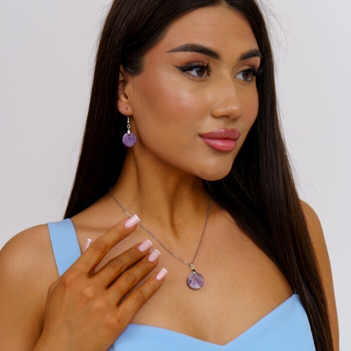 Набор бижутерии серьги и кулон с цепочкой с натуральным камнем Аметист, 10120, Уценка, арт.08.2209