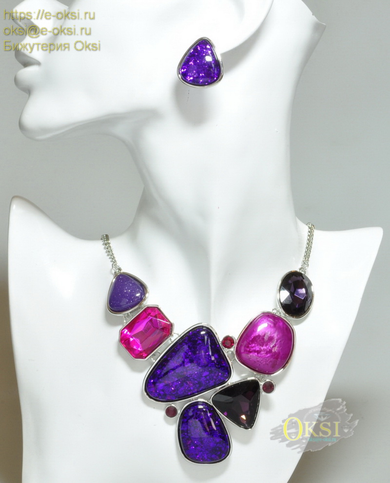 Очень красивый вечерний комплект «Искушение» из крупных синтетических камней .Удачно подобраны и отлично сочетаются сочные оттенки фиолетового цвета и нежные розово-лавандовые тона. Фиолетовый ( фиалковый) цвет - цвет мистический и таинственный, волшебный и загадочный. Благодаря высокой контрастности хорошо сочетается с яркими и пастельными оттенками. Качественное родиевое покрытие серебряного цвета. Длина колье 45 см + 5 см цепочка.