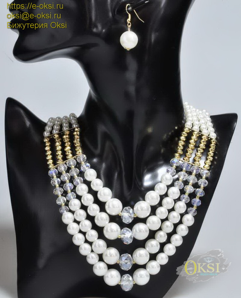Эффектный лёгкий, универсальный комплект с серьгами, из искусственного жемчуга и хрустальных бусин. Отлично подойдет и для торжества, и на каждый день . .Длина колье 45 см + 5 см цепочка.
