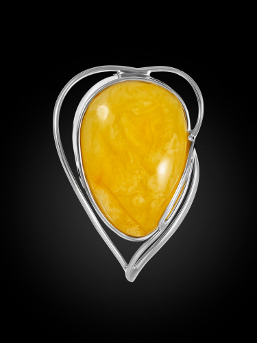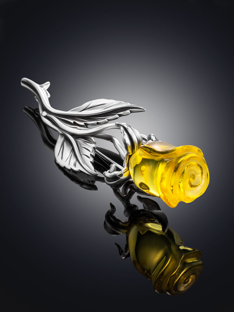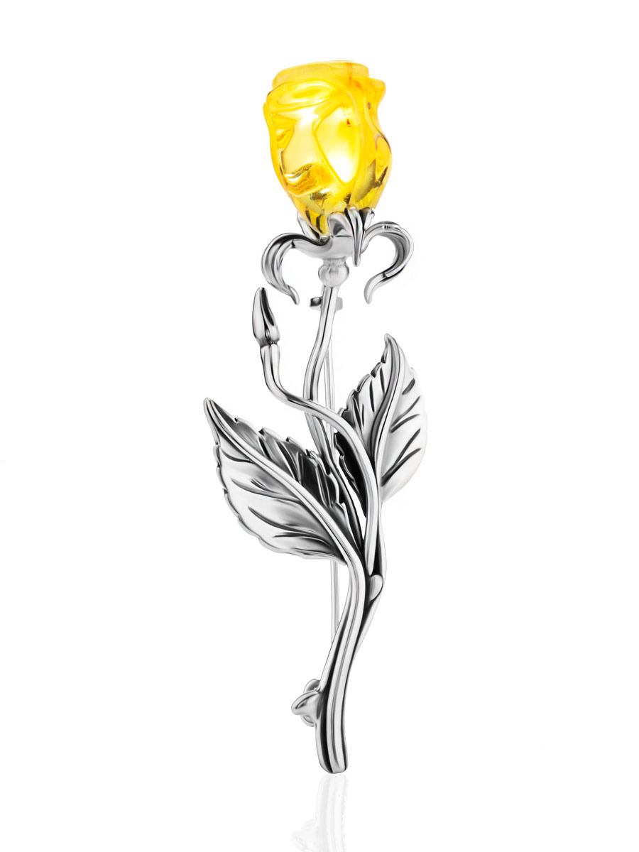 Нарядная брошь с натуральным янтарем лимонного цвета «Роза»