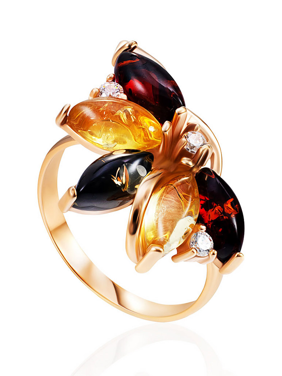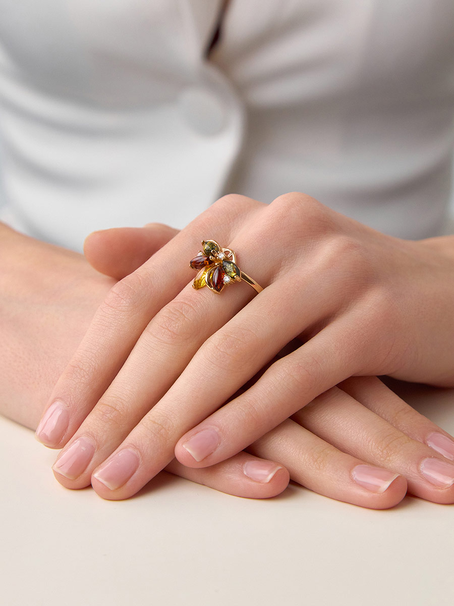 Нарядное кольцо «Лотос» с янтарём разных цветов и кристаллами