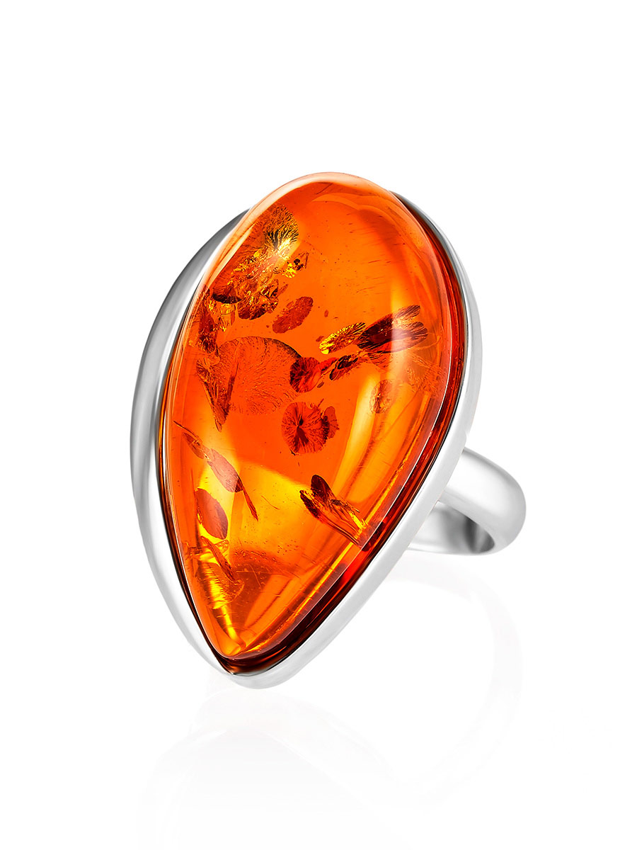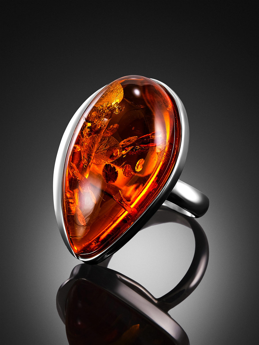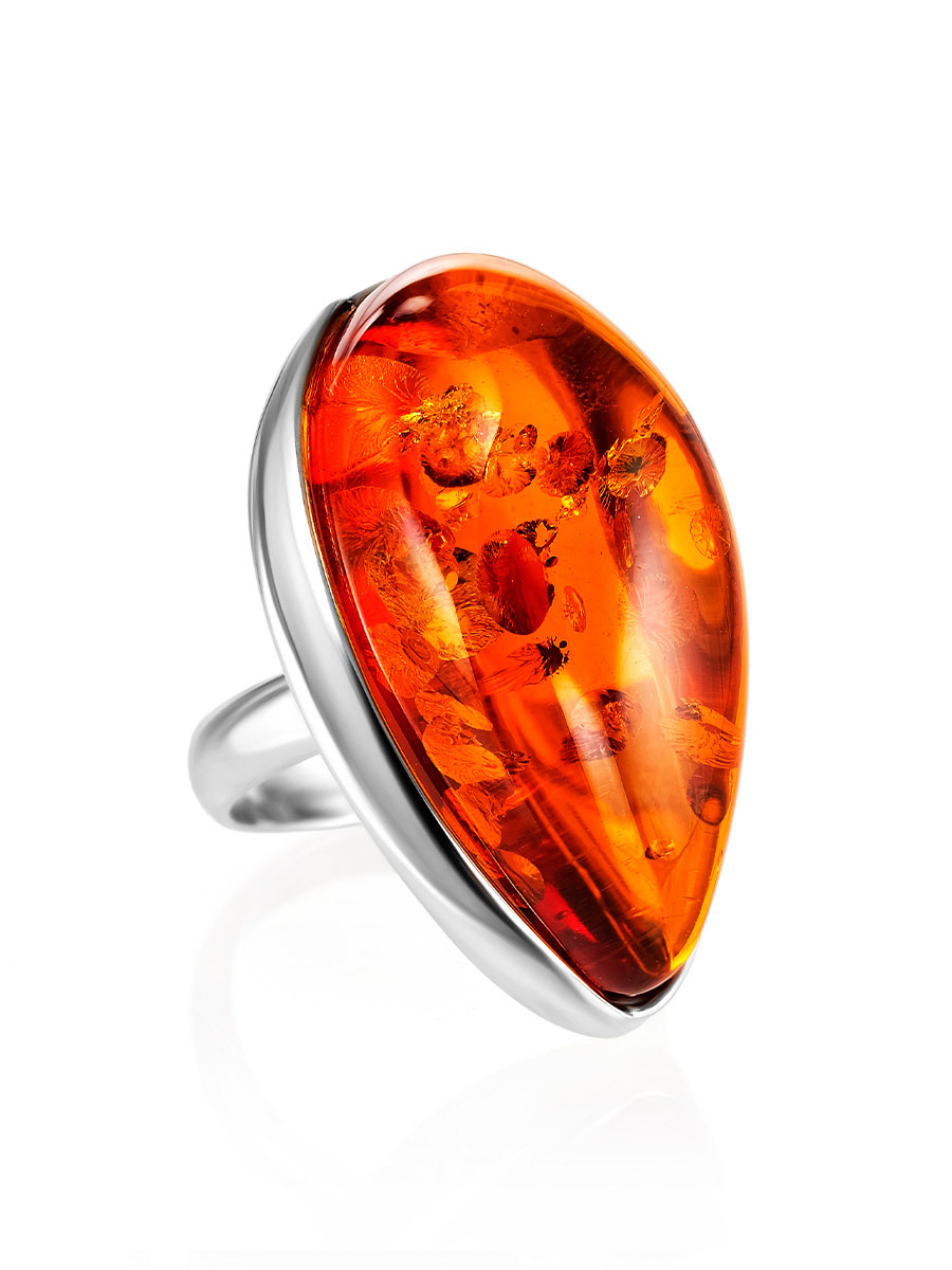 Нарядное кольцо с цельным натуральным янтарем коньячного цвета с искорками «Лагуна»