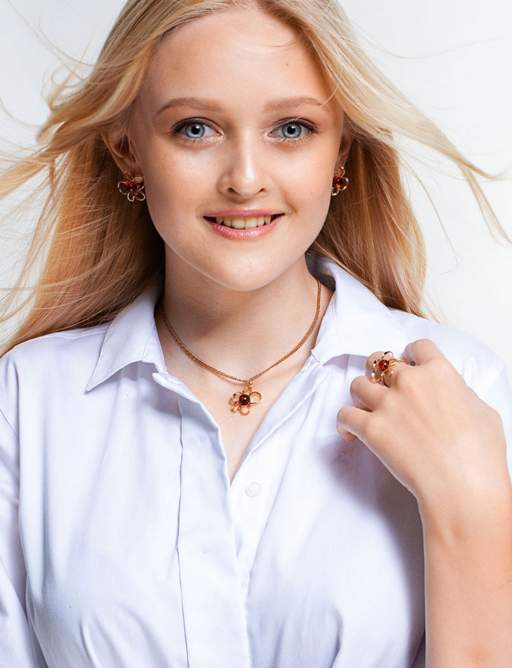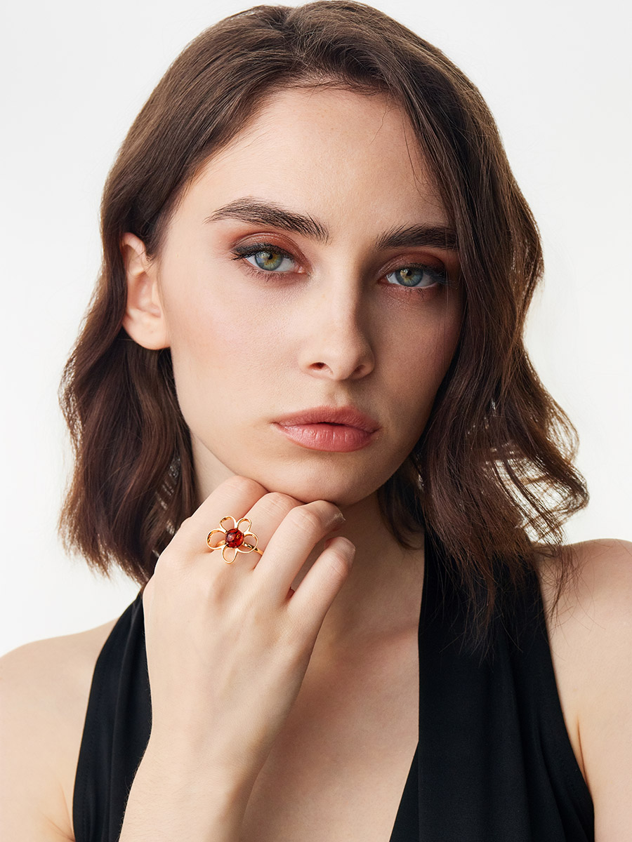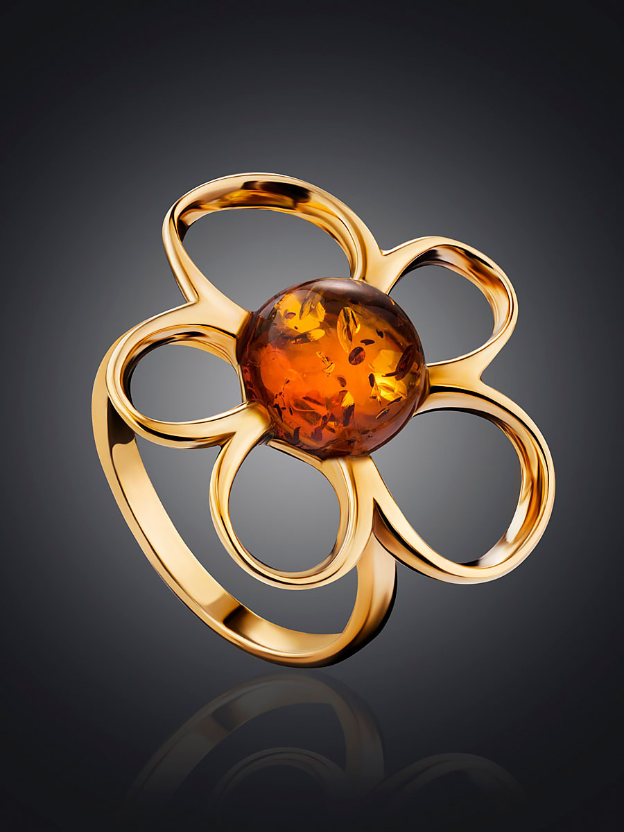 Нарядное кольцо с коньячным янтарём «Ромашка»