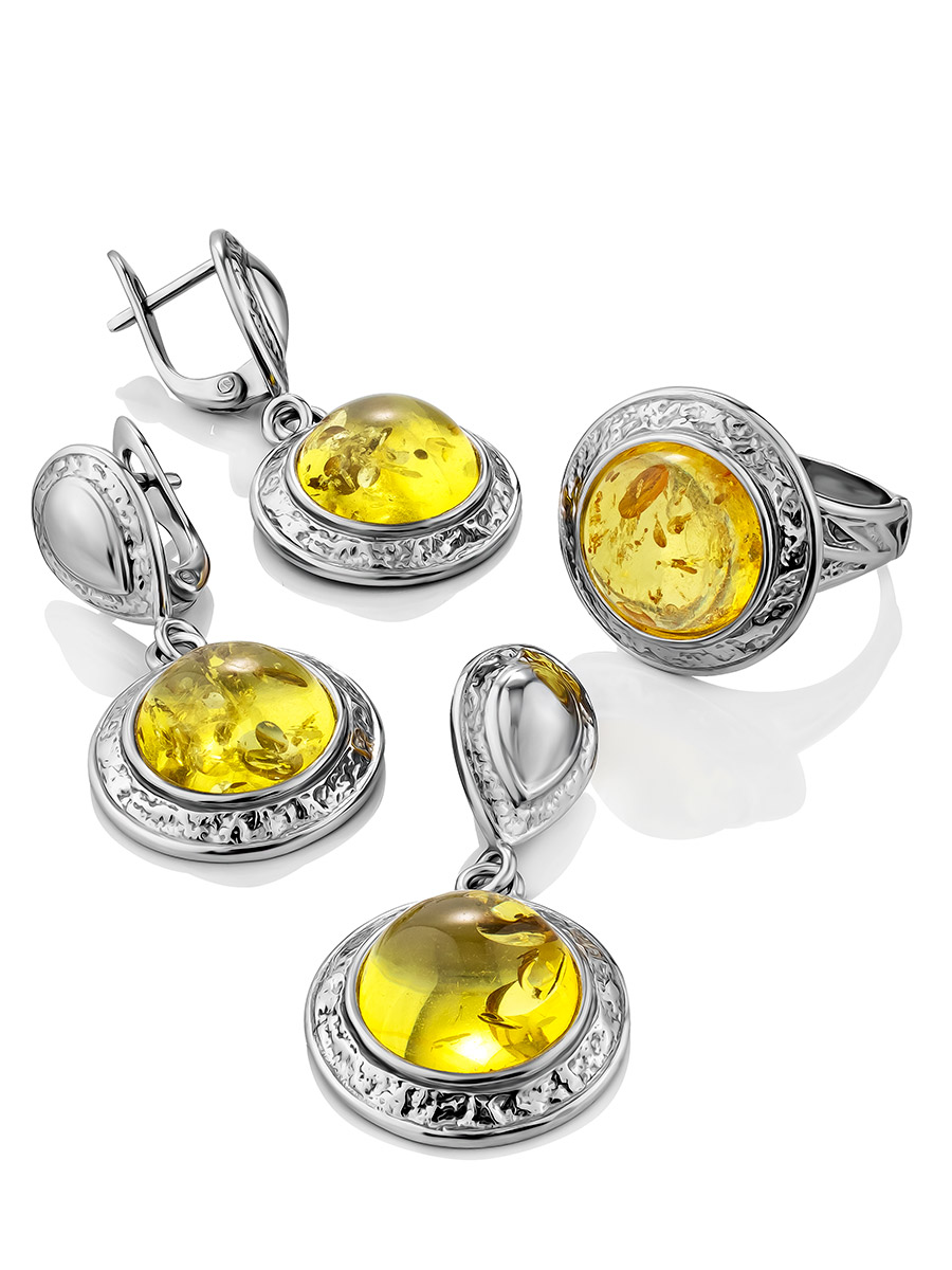 Представляем вам новый великолепный дизайн украшений из янтаря в серебре, в котором гармонично сочетаются изящно обработанное серебро и теплый сверкающий янтарь круглой формы насыщенного золотисто-лимонного оттенка._x000D_