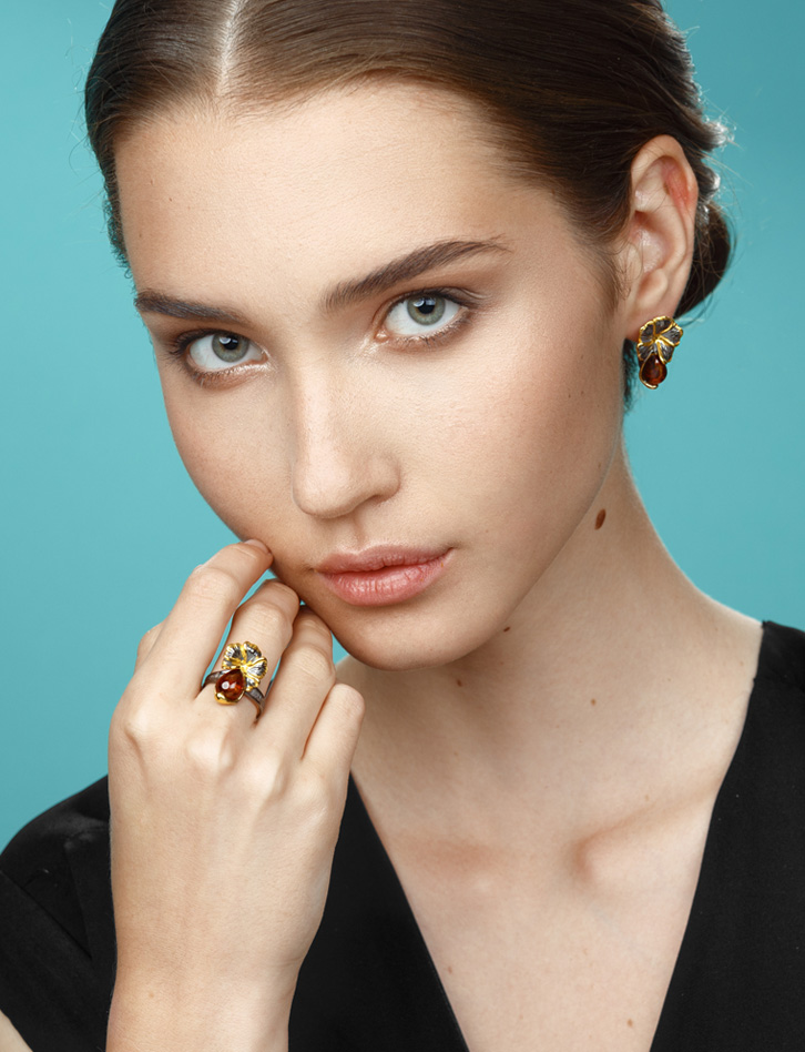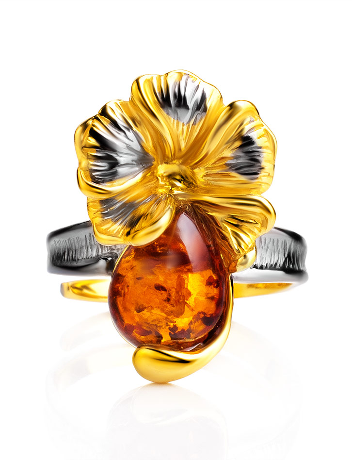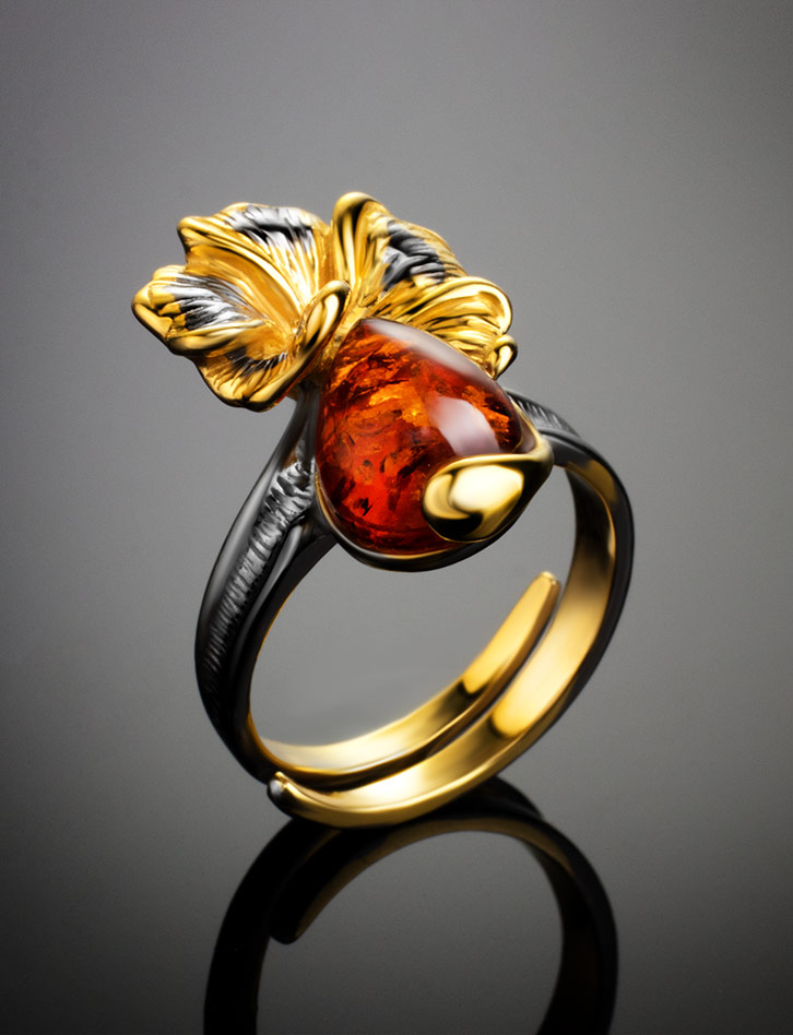 Нарядное кольцо с янтарём коньячного цвета «Петуния»