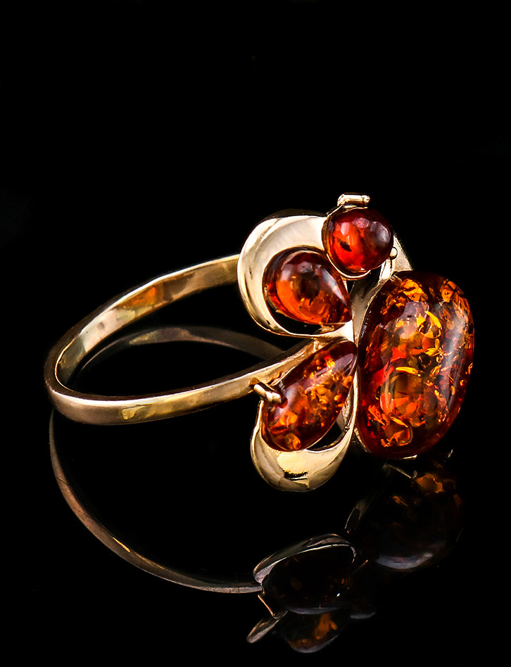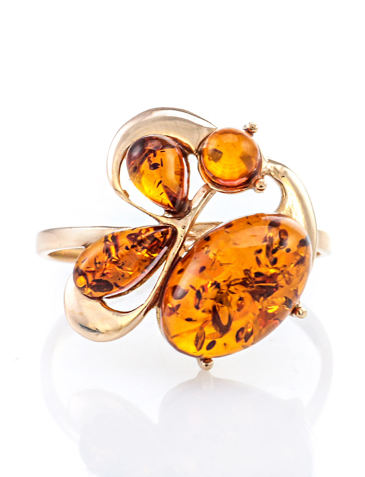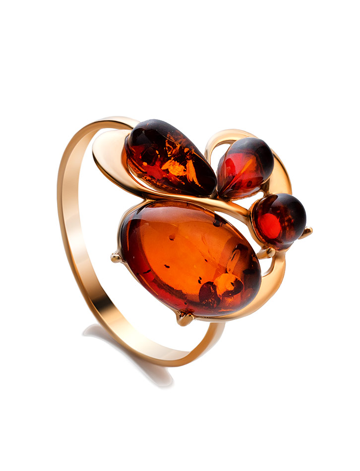 Нарядное позолоченное кольцо «Симфония» с коньячным янтарём