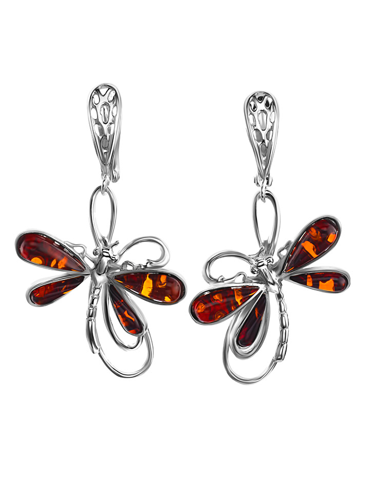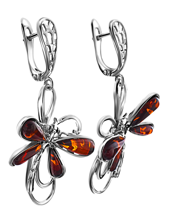 Нарядные эффектные серьги из натурального вишнёвого янтаря «Стрекоза»