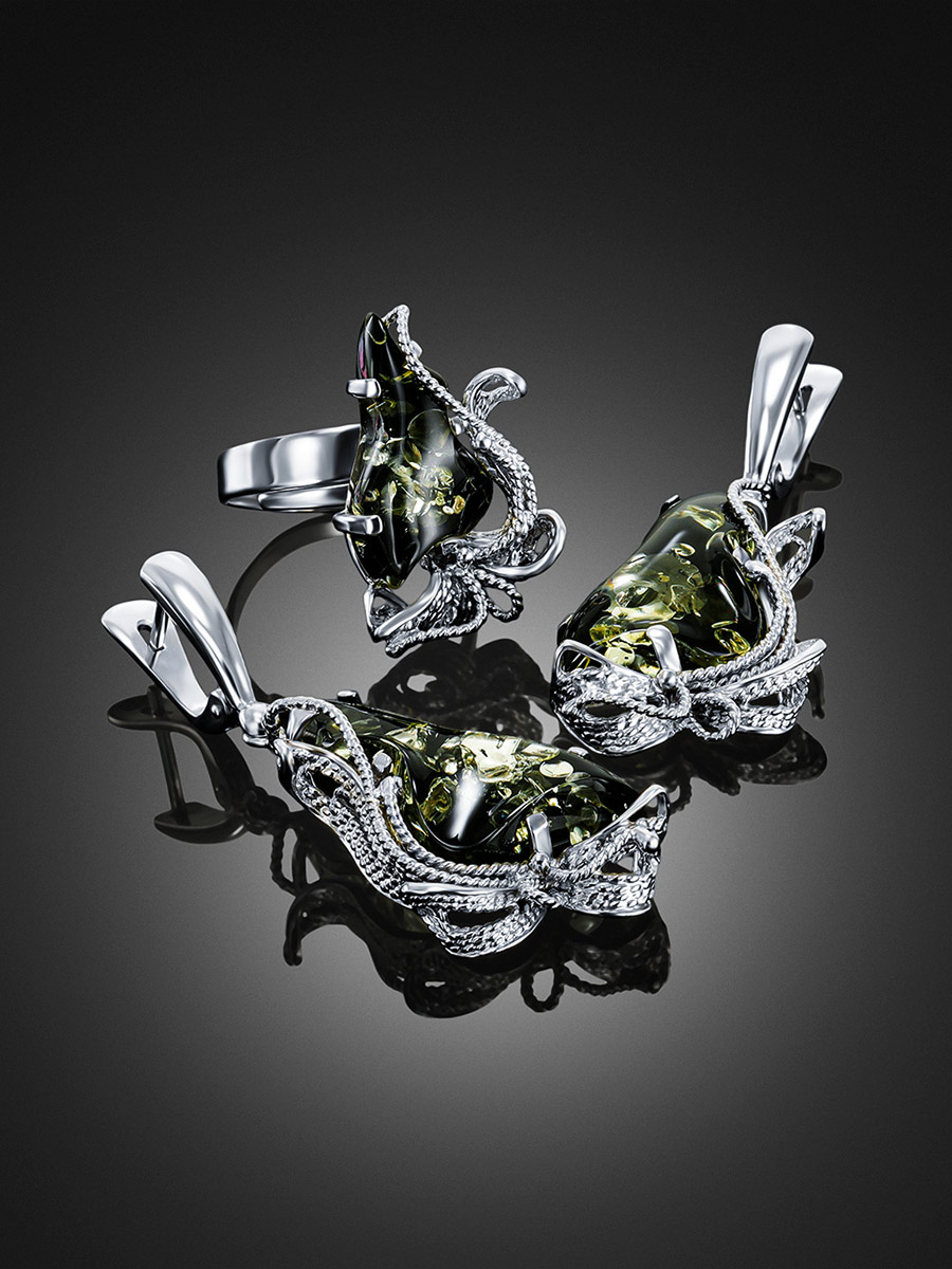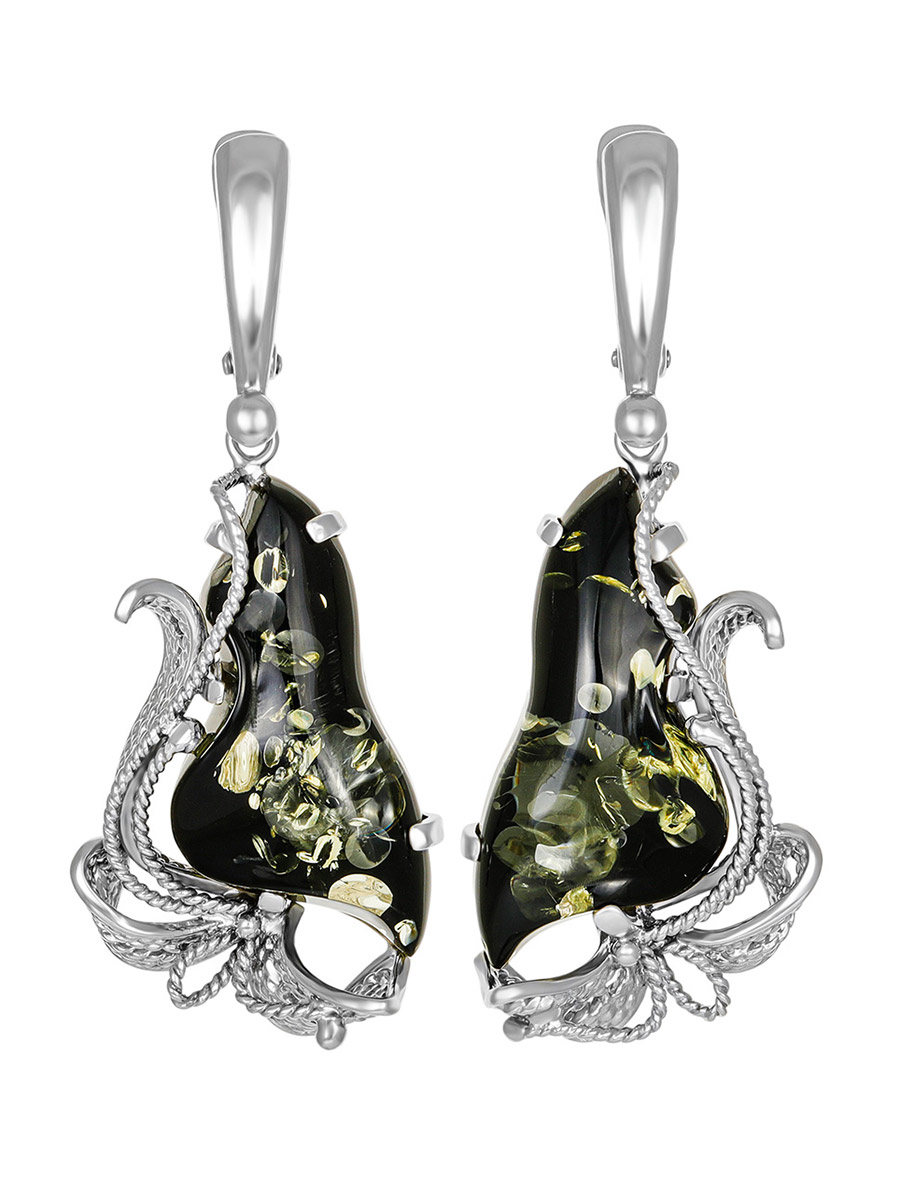 Нарядные серьги с искрящимся янтарем зелёного цвета «Филигрань»
