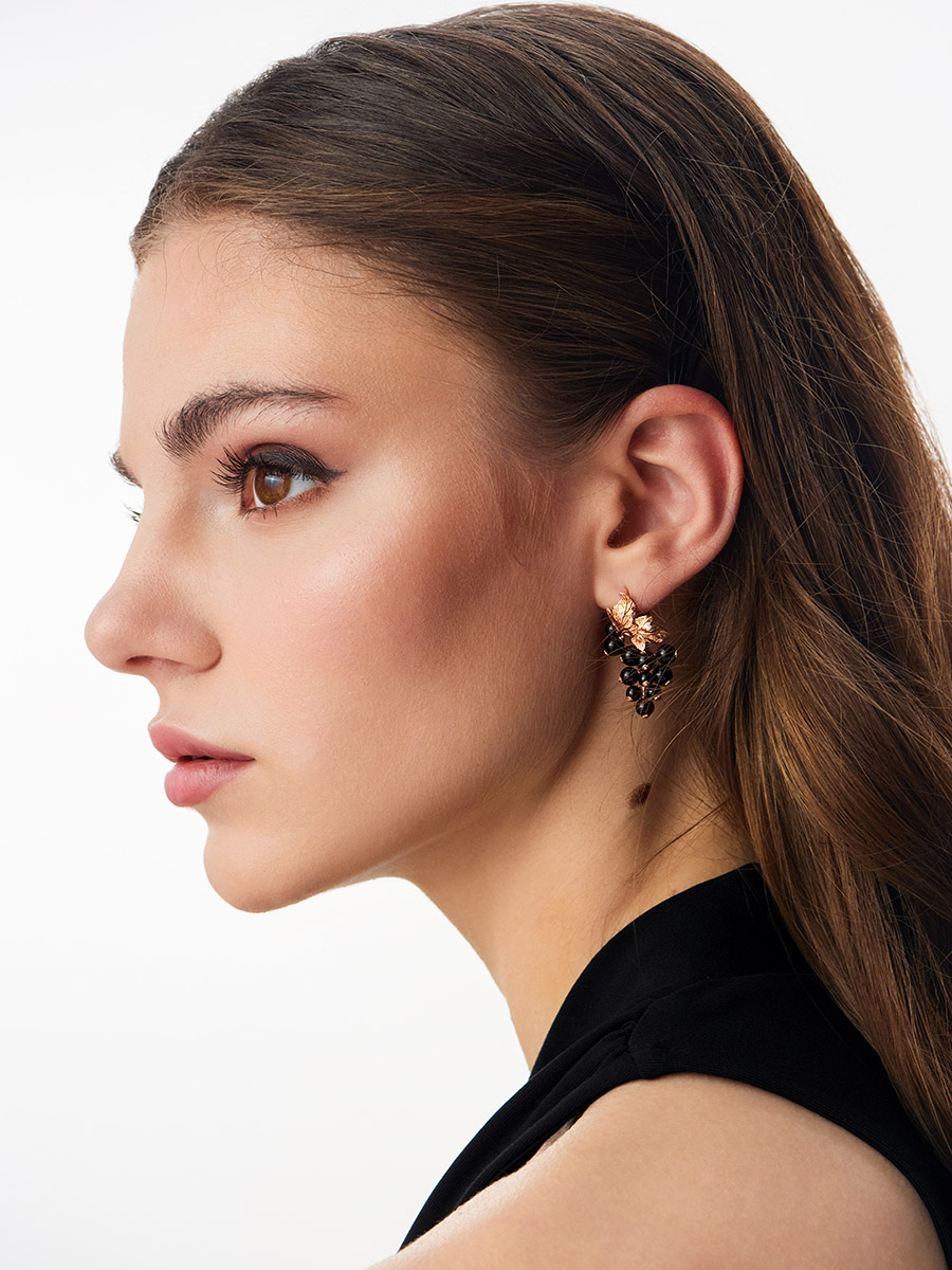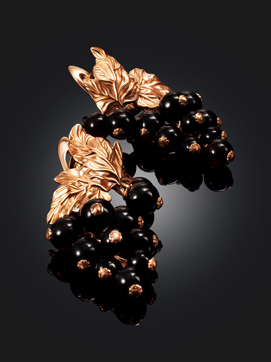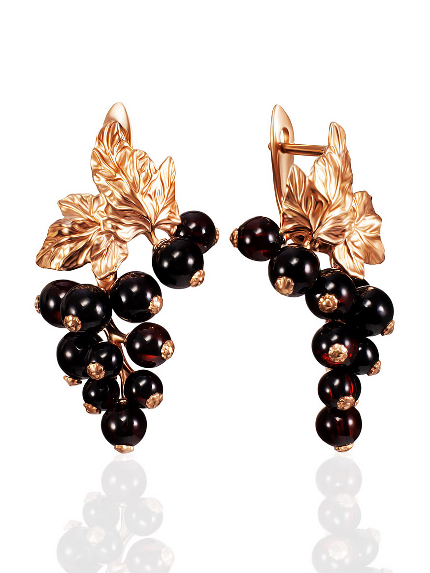 Нарядные серьги с янтарём вишнёвого цвета «Виноград»